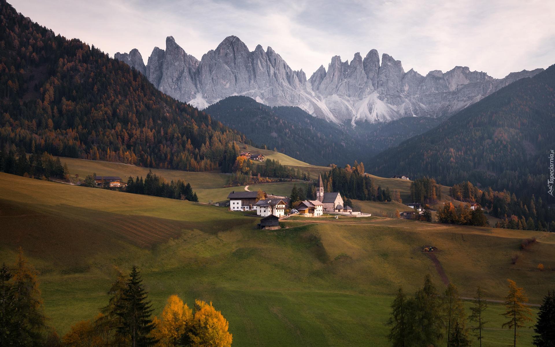 Edytor tapety: Wieś Santa Maddalena w Dolomitach jesienną porą