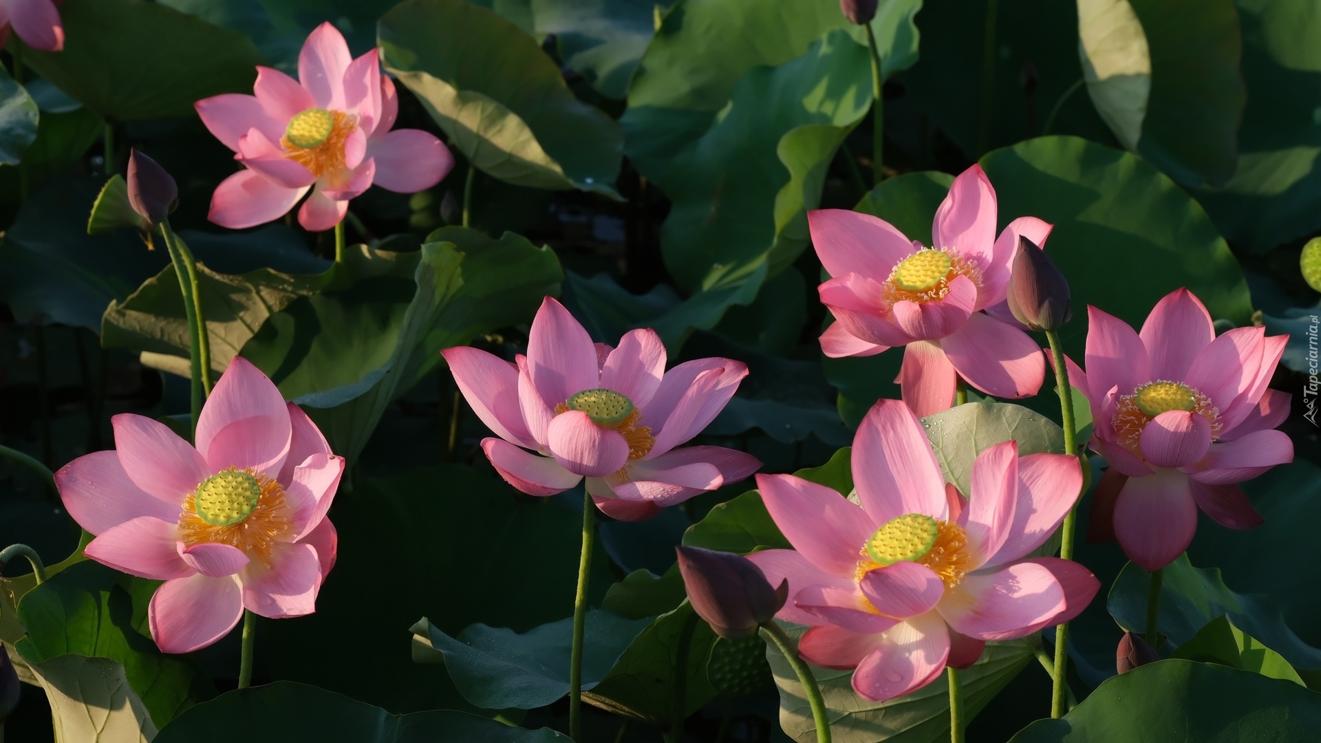 Edytor tapety: Rozwinięte różowe lotosy wśród liści