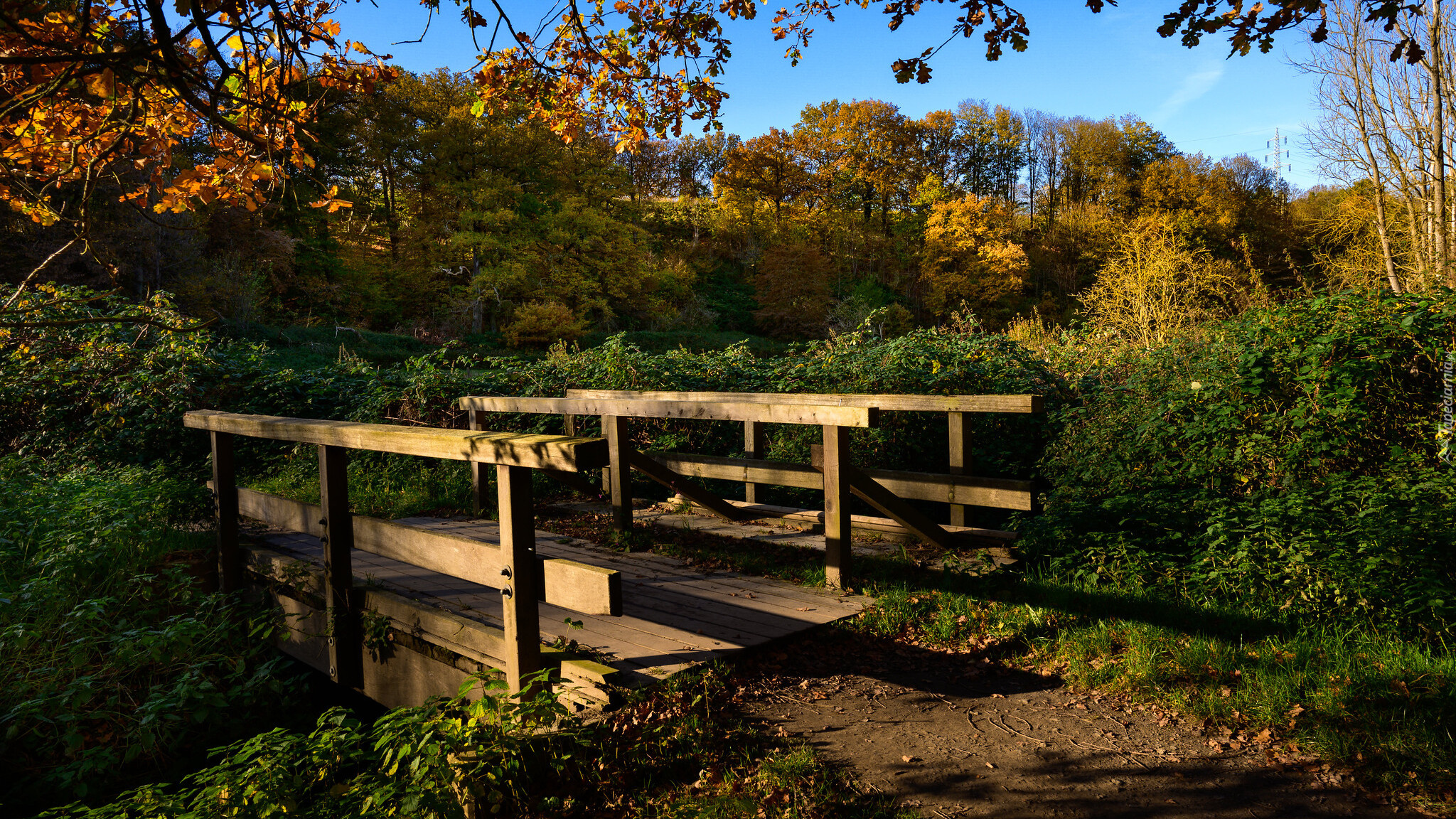 Edytor tapety: Jesienne drzewa i krzewy obok drewnianego mostku