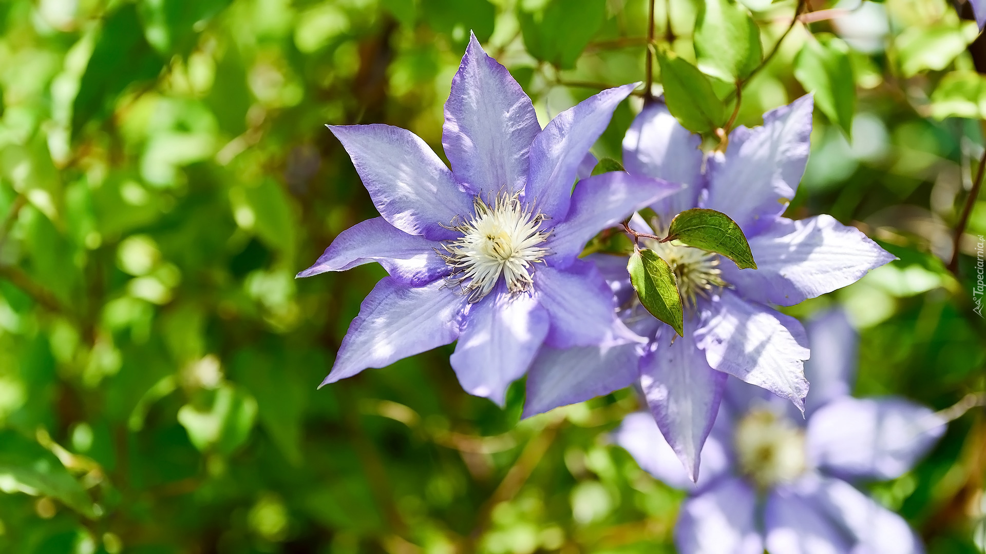 Edytor tapety: Rozświetlone słońcem jasnofioletowe powojniki