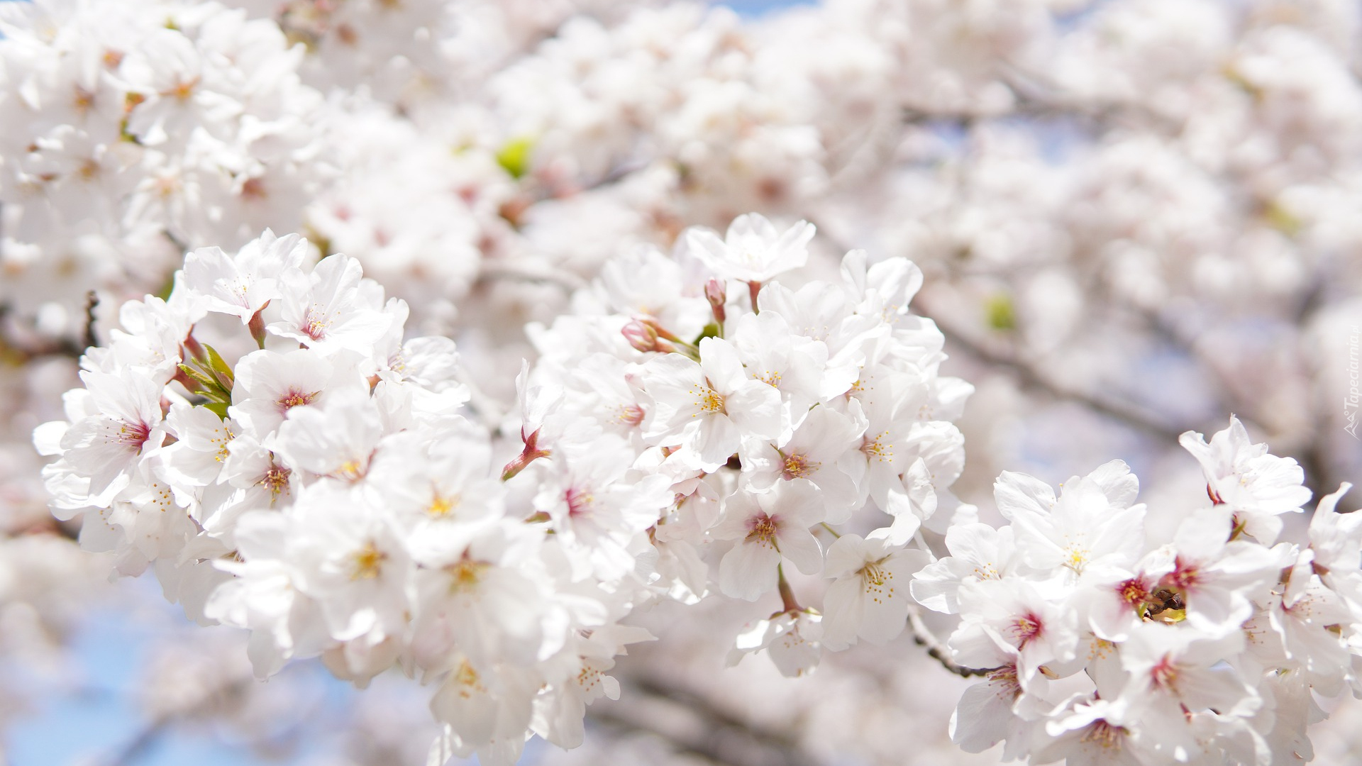 Edytor tapety: Kwitnąca wiśnia japońska z białymi kwiatkami