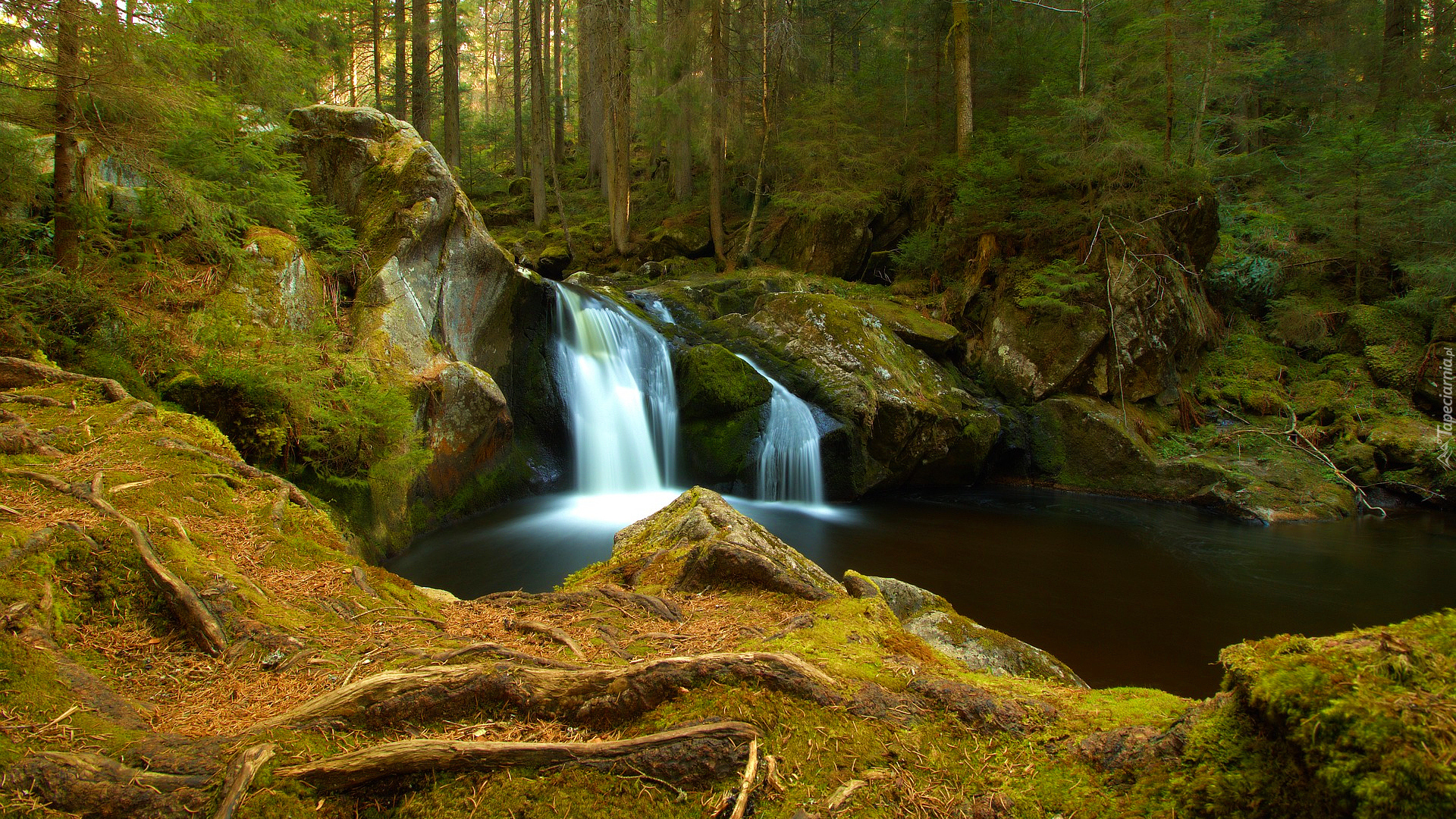 Edytor tapety: Próg skalny na leśnej rzece i omszone kamienie