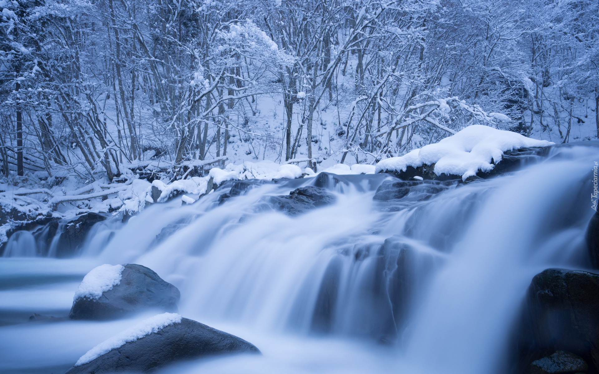 Edytor tapety: Ośnieżone gałęzie i kamienie w rzece