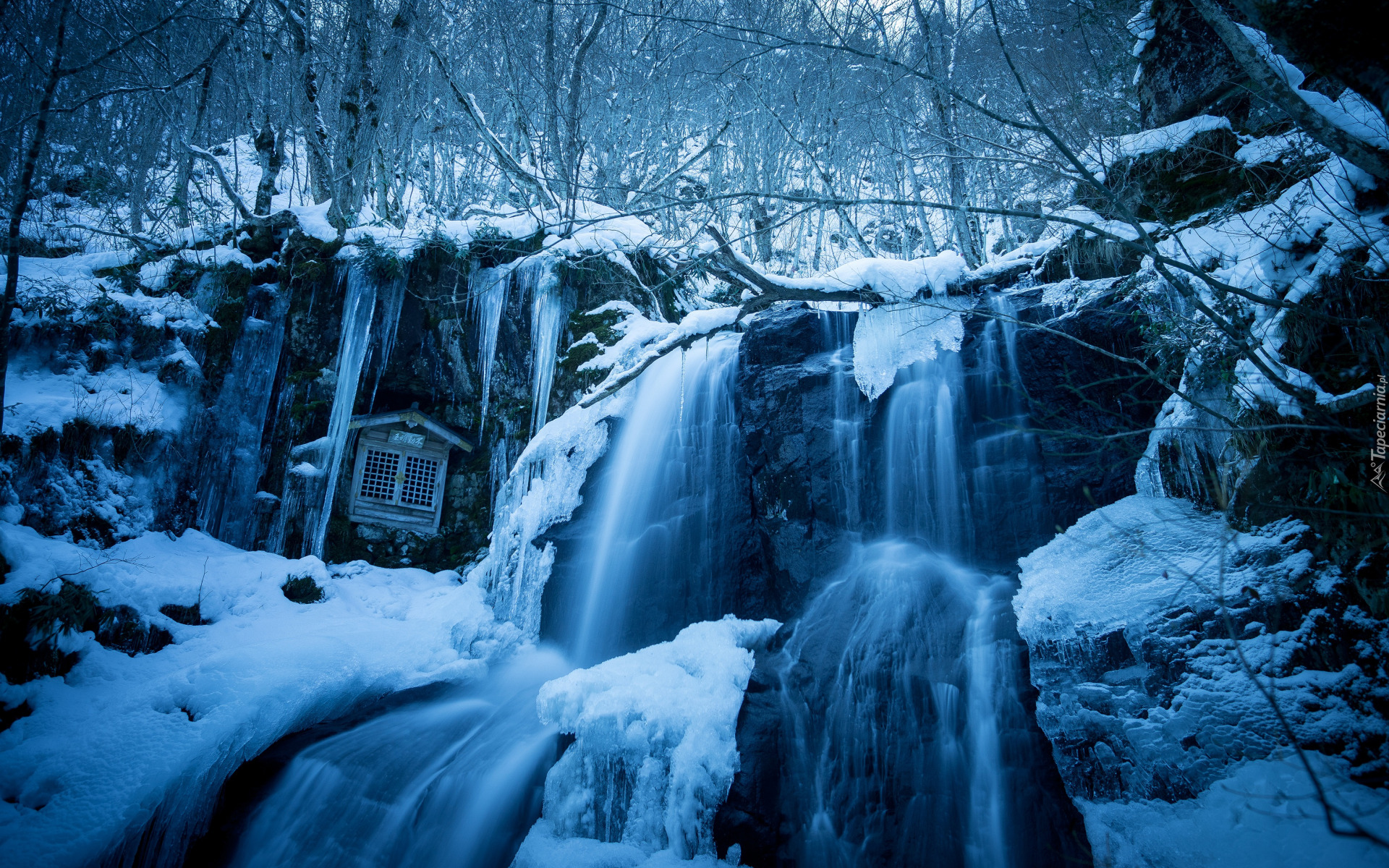 Edytor tapety: Sople i śnieg na skałach leśnego wodospadu