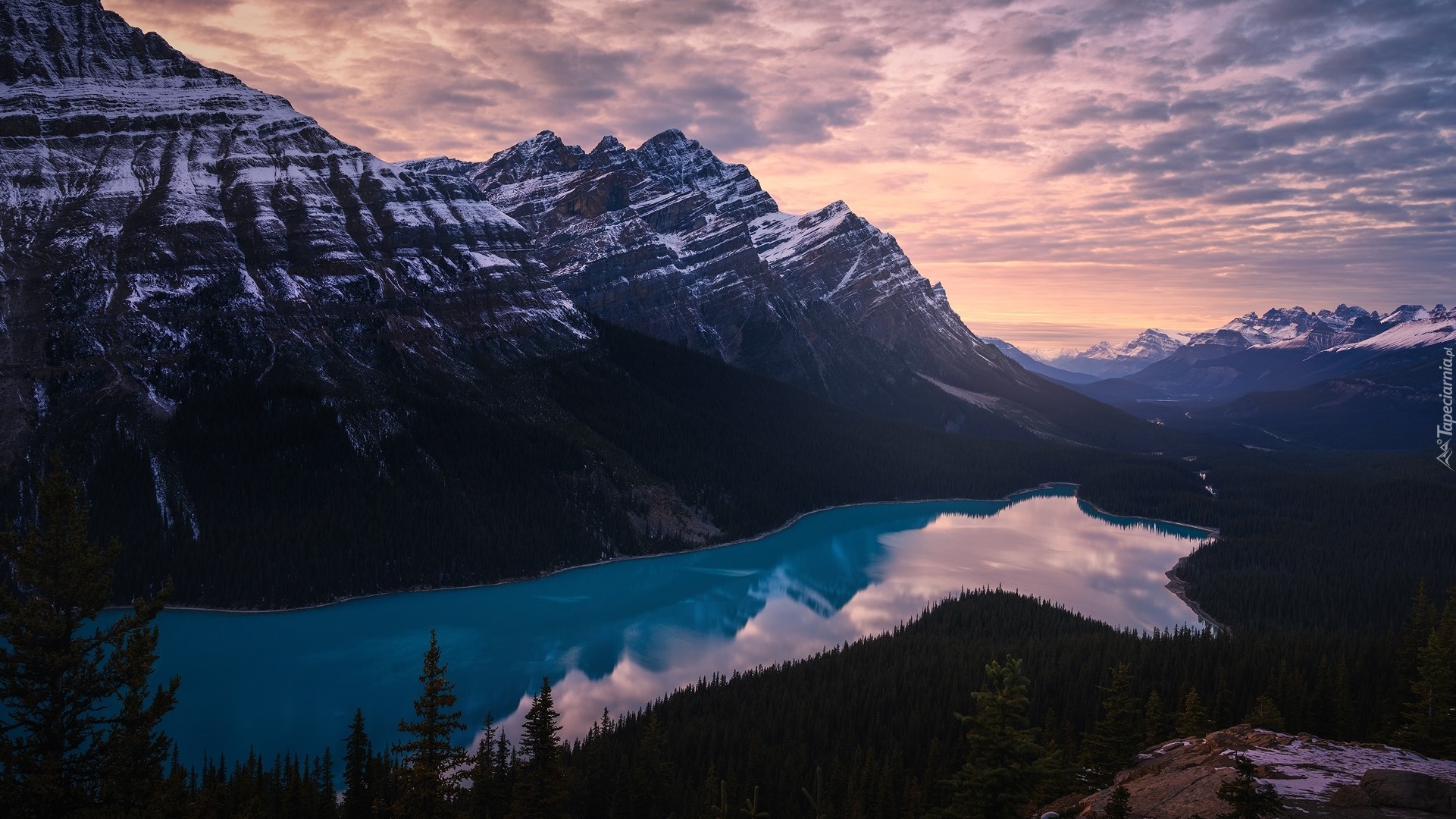 Edytor tapety: Zachodzące słońce nad górami i jeziorem Peyto Lake