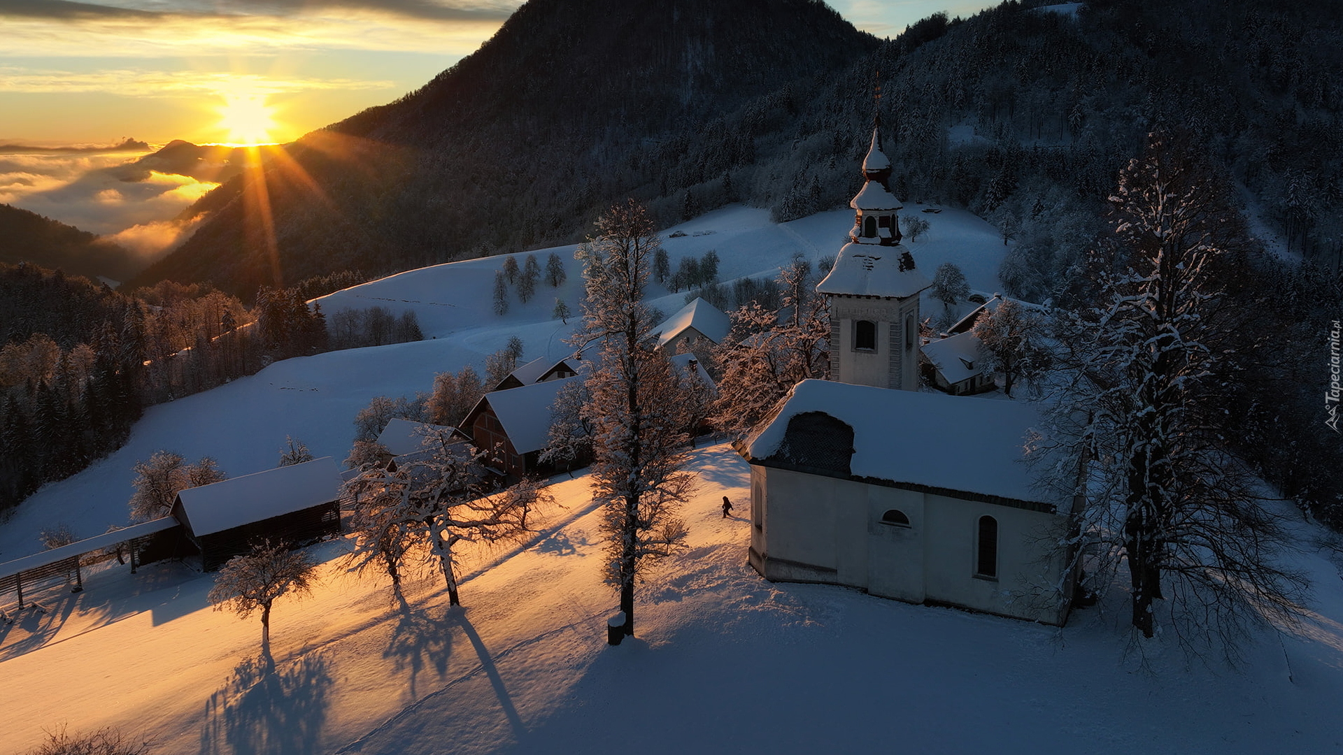 Edytor tapety: Ośnieżony kościół i domy w gminie Skofja Loka