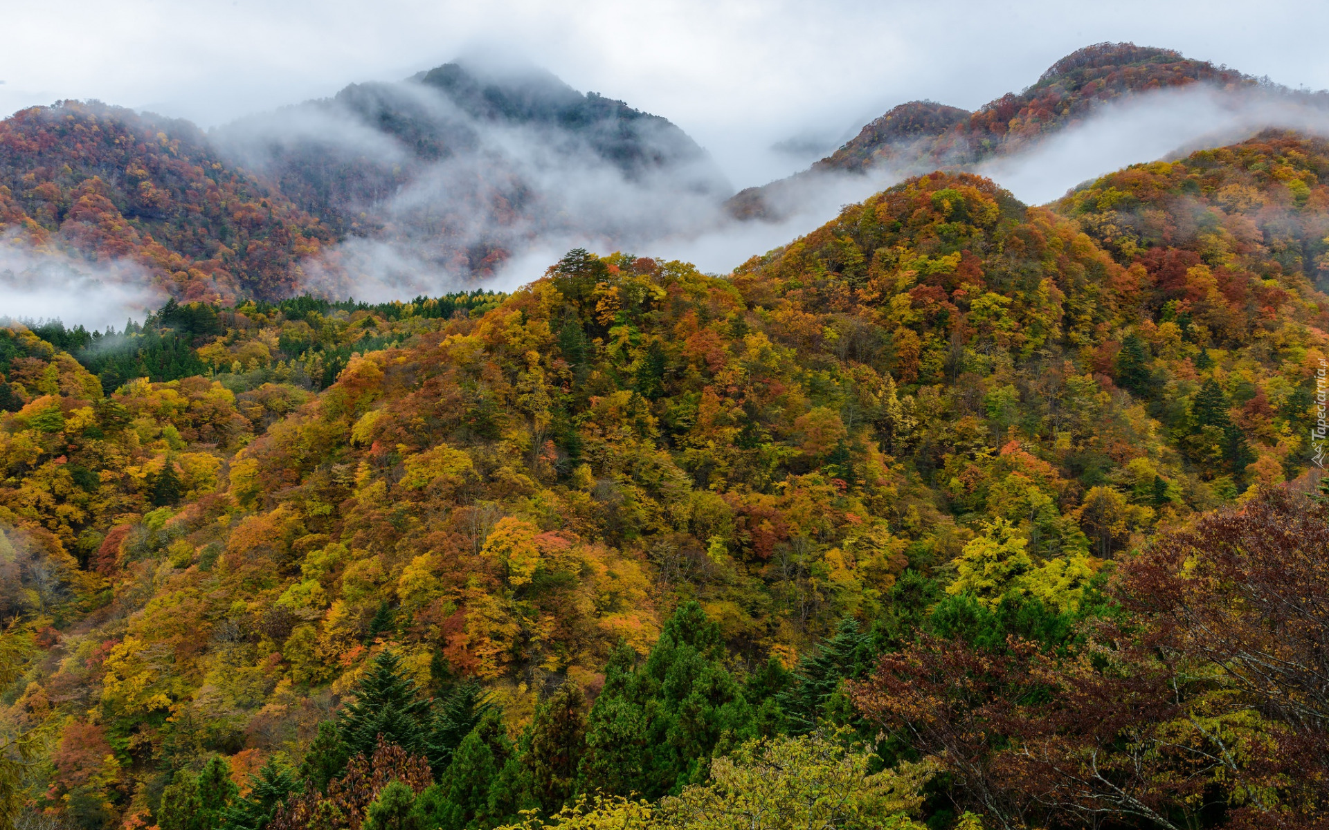 Edytor tapety: Mgła nad zalesionymi górami jesienią