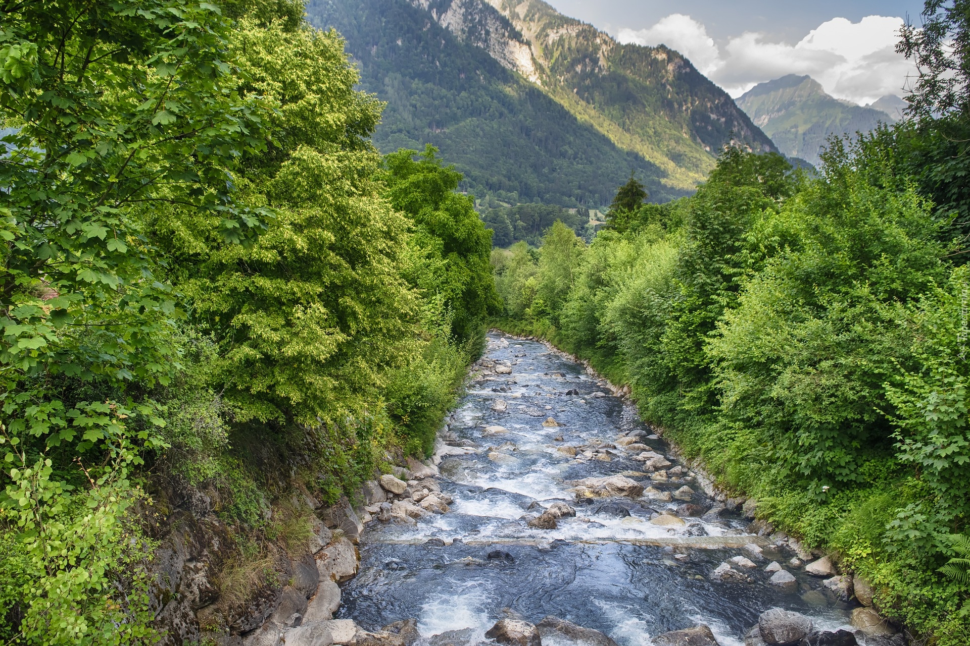 Edytor tapety: Drzewa i krzewy nad kamienistą rzeką w górach