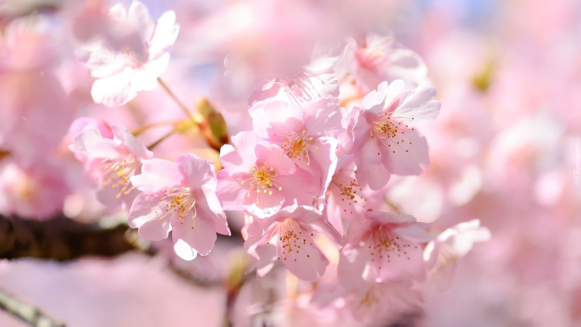 Edytor tapety: Rozświetlone jasnoróżowe kwiaty wiśni japońskiej