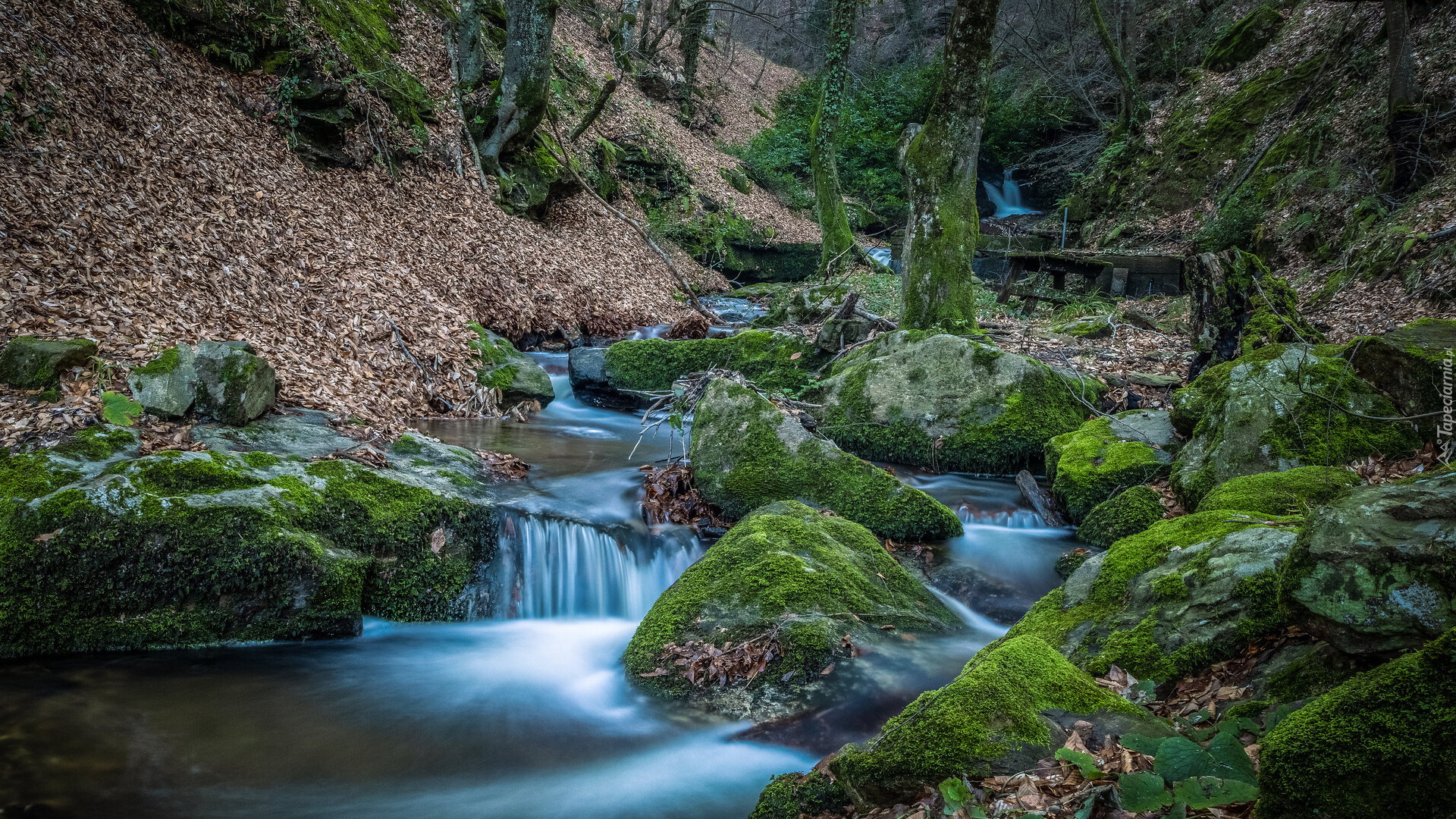 Edytor tapety: Omszałe kamienie na leśnym strumieniu