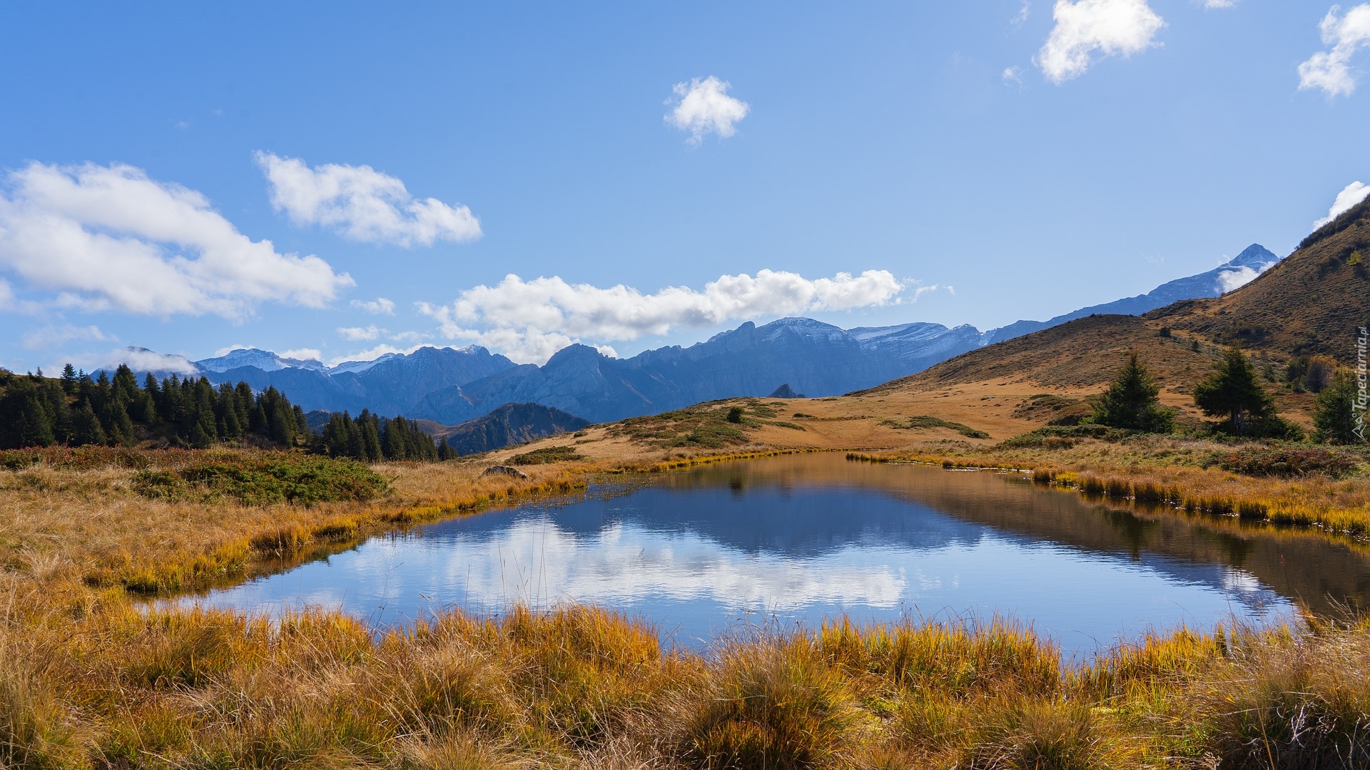 Edytor tapety: Pożółkła trawa wokół stawu na tle gór