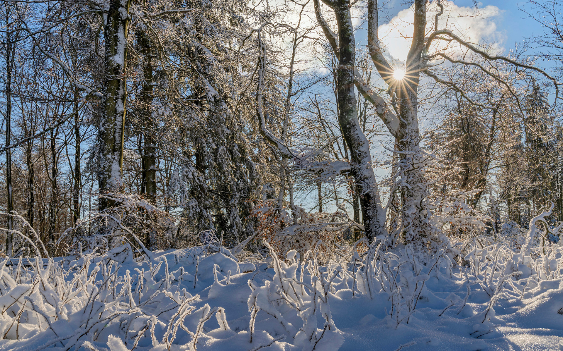 Edytor tapety: Ośnieżone drzewa i rośliny w słonecznych promieniach
