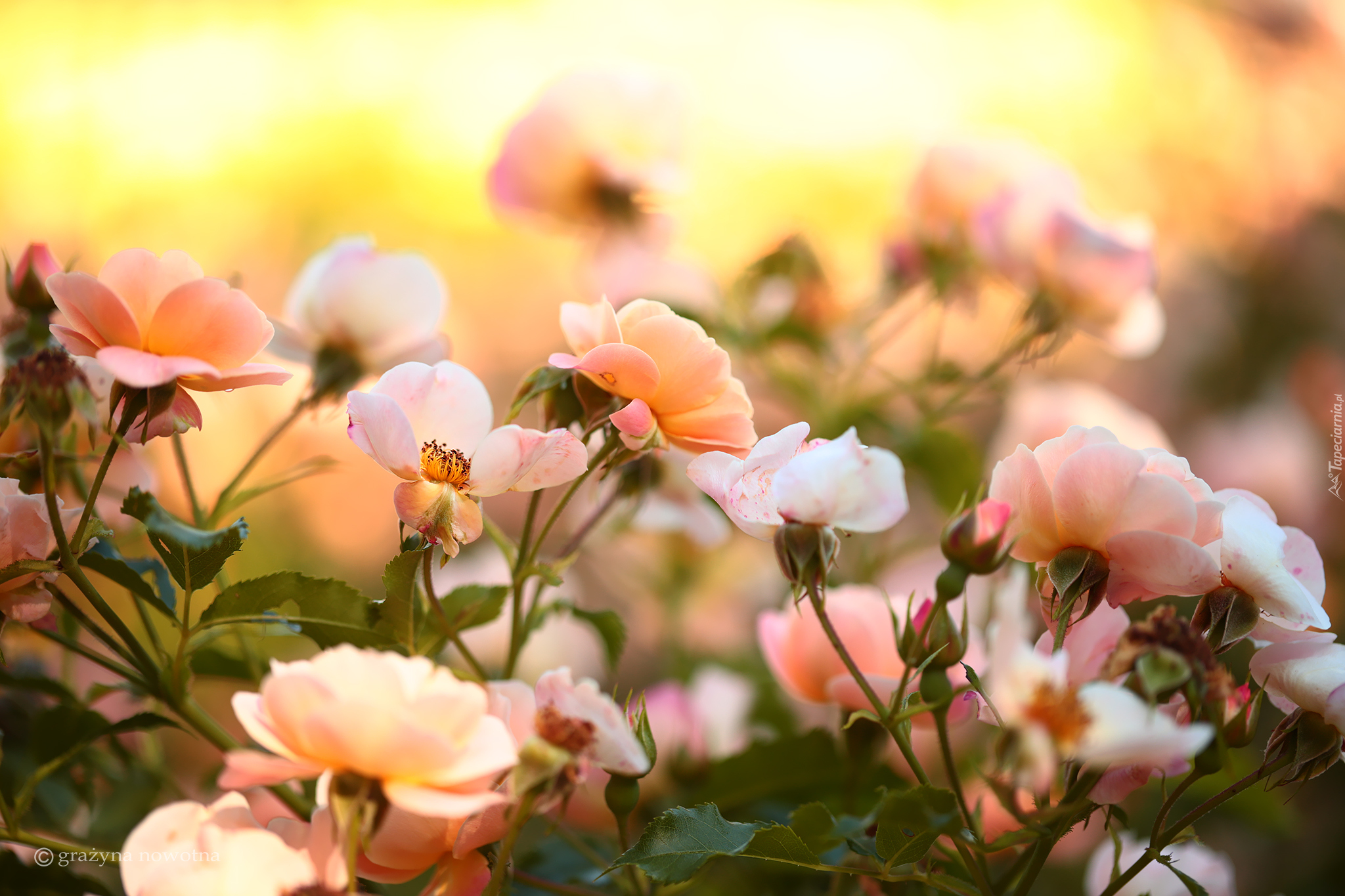 Edytor tapety: Rozkwitnięte róże z pąkami na rozświetlonym tle