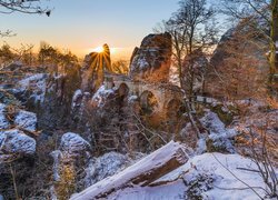 Edytor tapety: Ośnieżone skały i drzewa obok formacji skalnej Bastei w Górach Połabskich