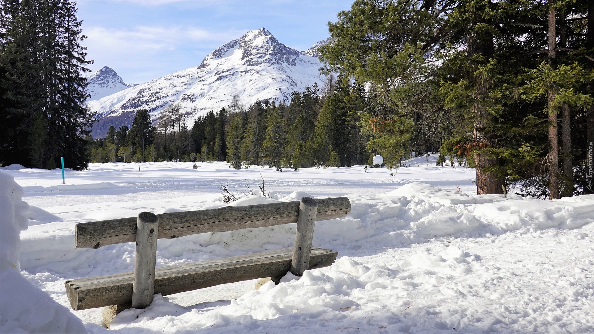 Edytor tapety: Zaśnieżona ławka na polanie z widokiem na góry