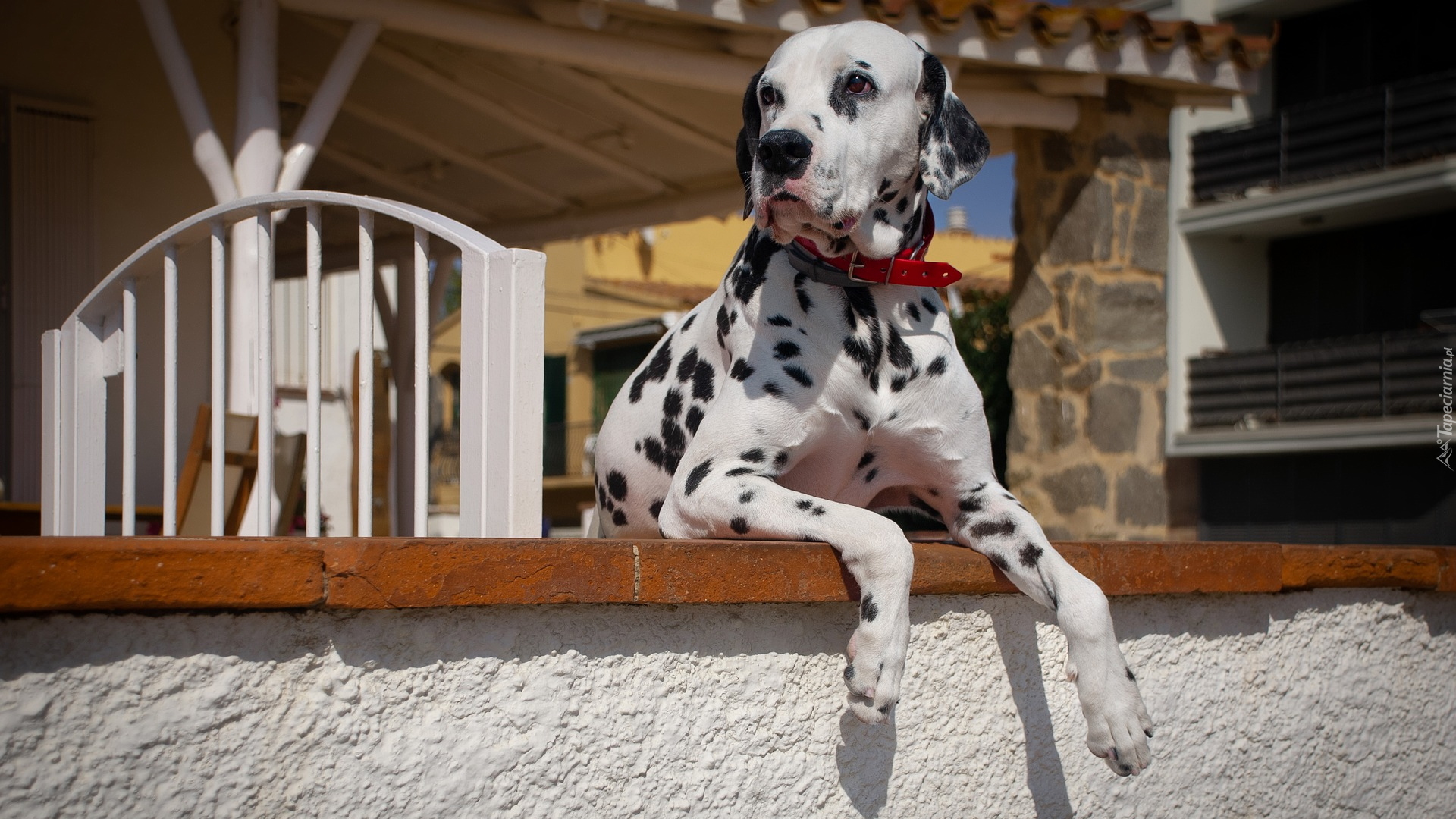 Edytor tapety: Dalmatyńczyk oparty o murek