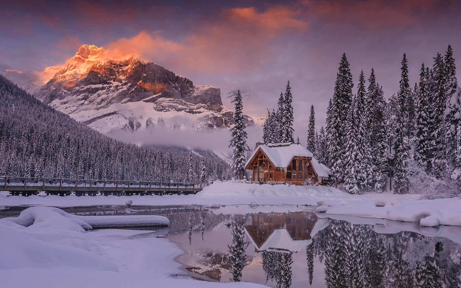 Edytor tapety: Zaśnieżony dom i jezioro Emerald Lake w Kanadzie