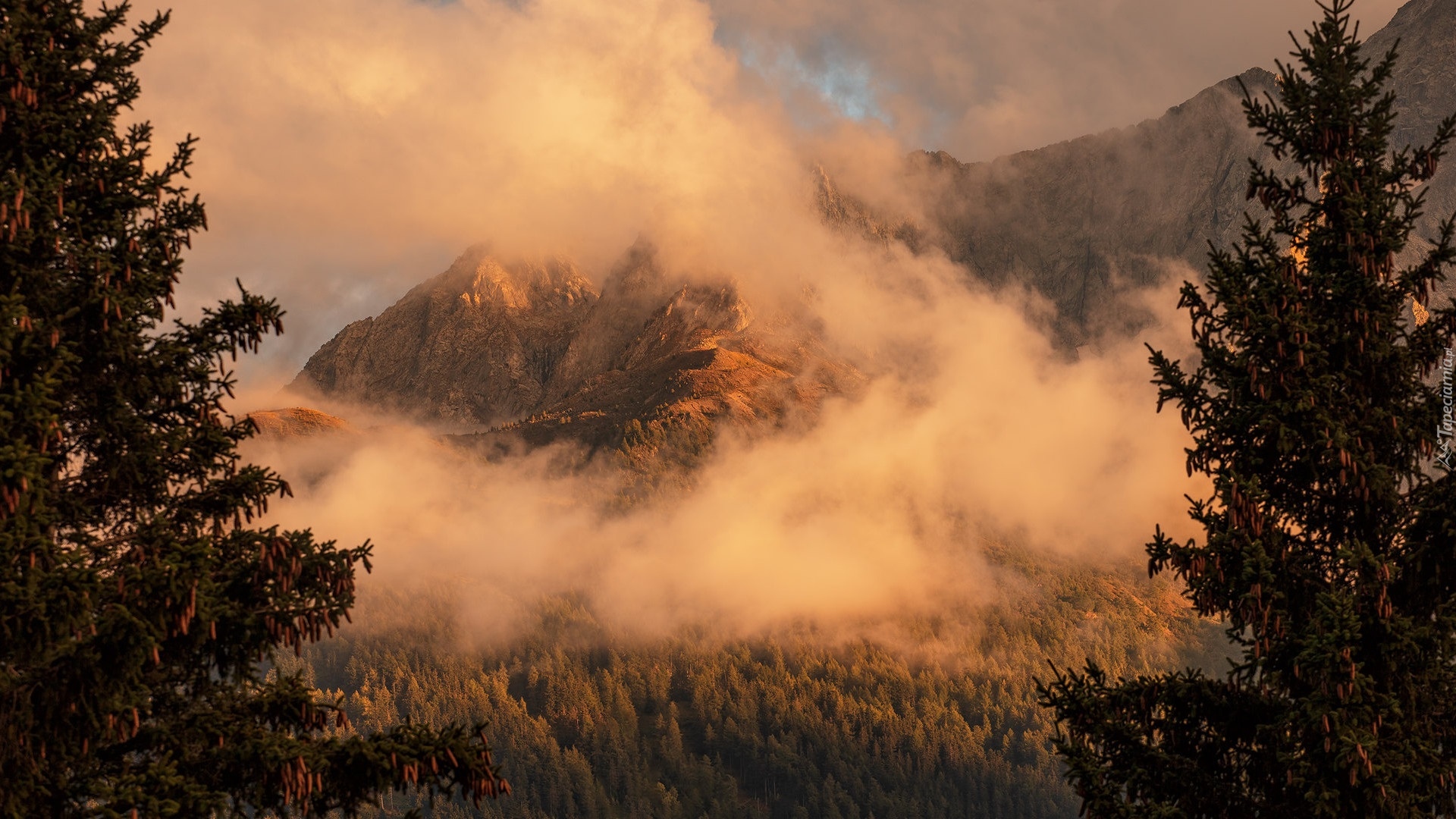 Edytor tapety: Poranna mgła unosząca się nad lasami i górami