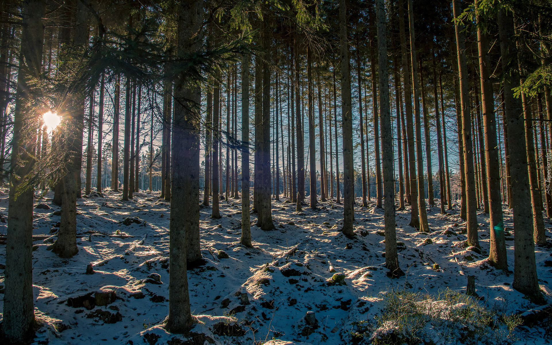 Edytor tapety: Wysokie drzewa w zimowych promieniach słońca