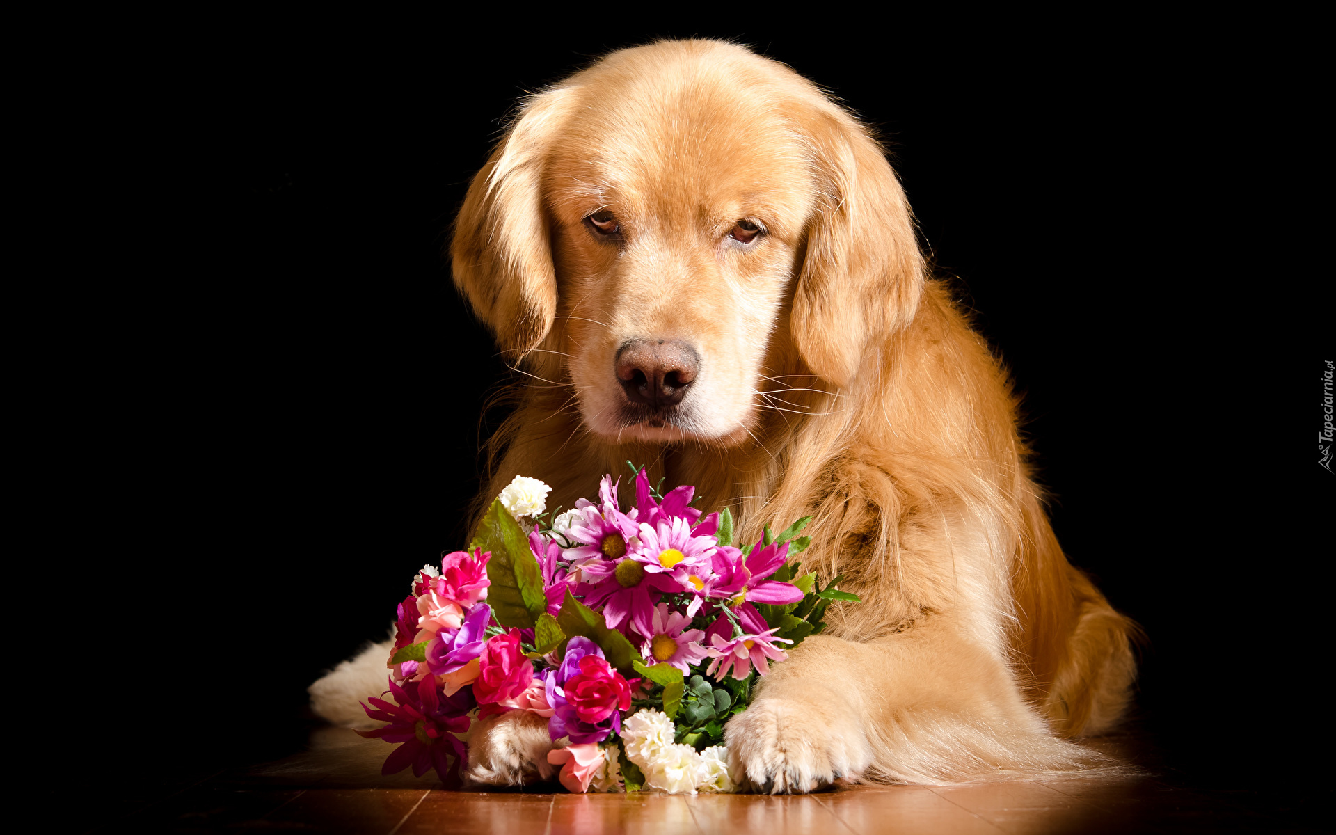 Edytor tapety: Golden retriever z kwiatami w łapach