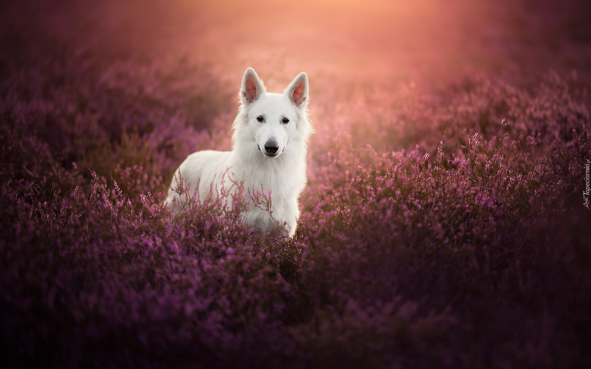 Edytor tapety: Biały owczarek szwajcarski wśród wrzosów