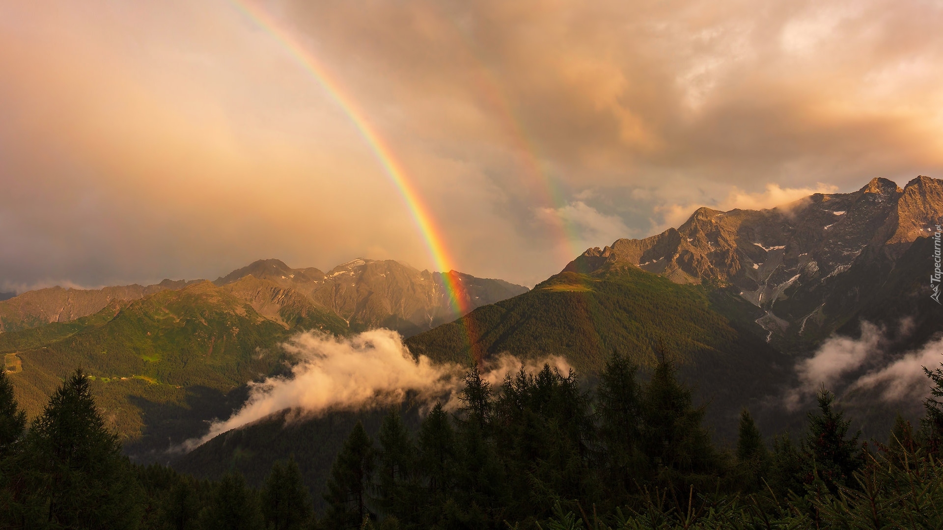Edytor tapety: Podwójna tęcza nad górami i lasami