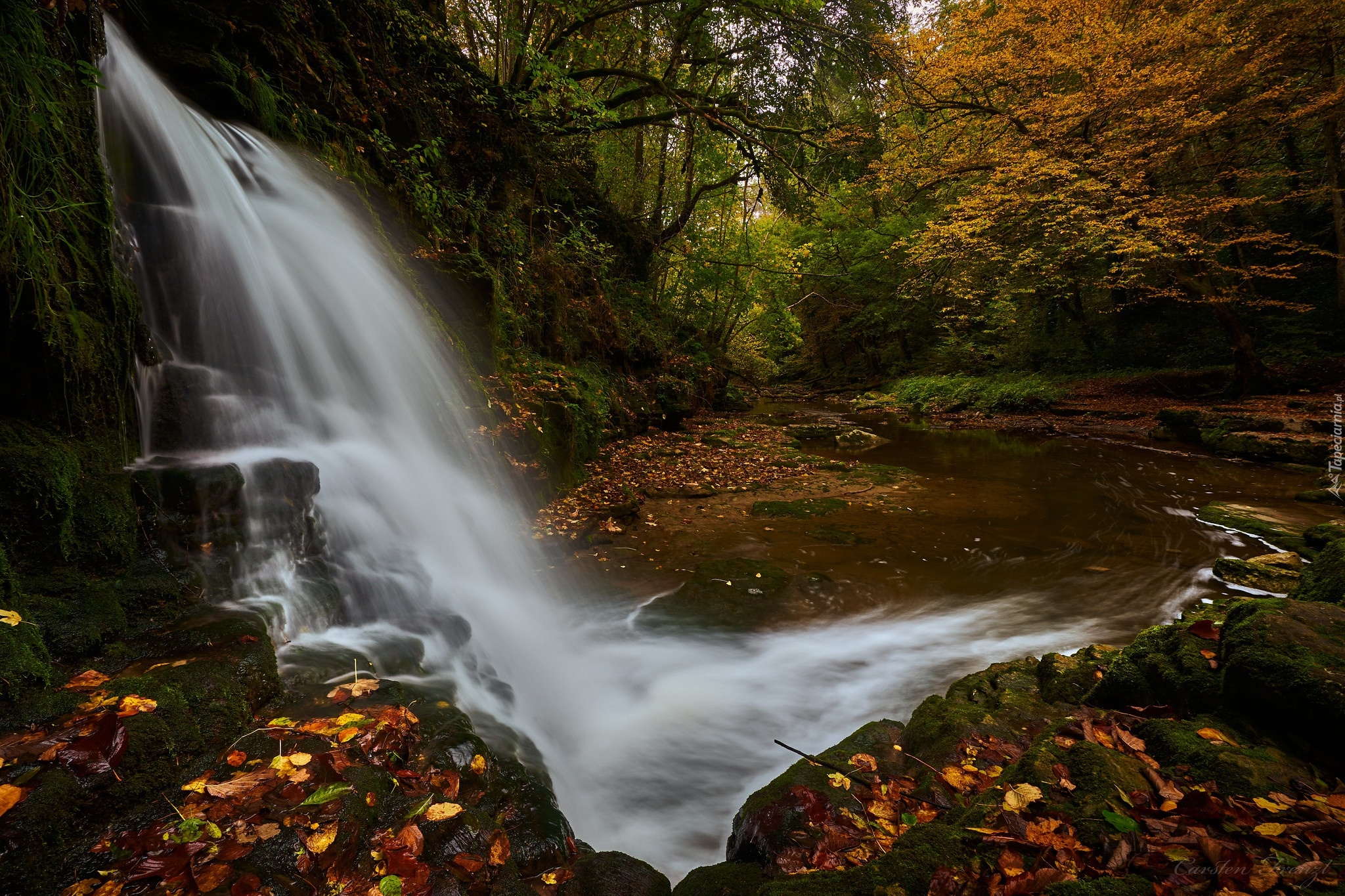 Edytor tapety: Wodospad na skałach wpadający do leśnej rzeki