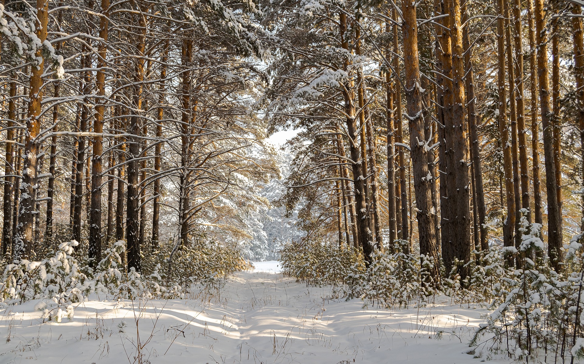 Edytor tapety: Zasypana śniegiem droga w słonecznym lesie
