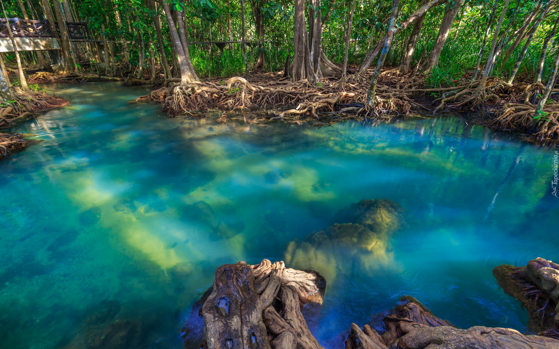 Edytor tapety: Korzenie drzew na brzegu jeziora