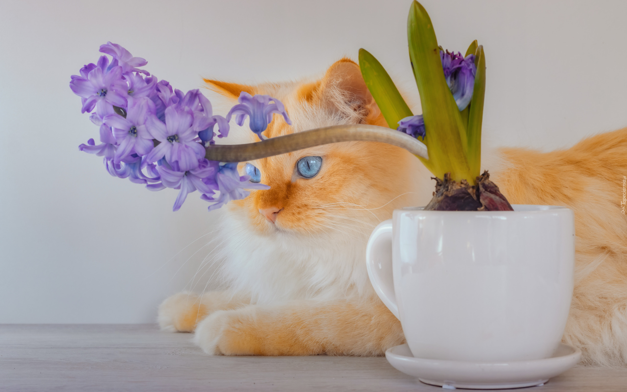Edytor tapety: Biszkoptowy kot obok filiżanki z kwitnącym hiacyntem