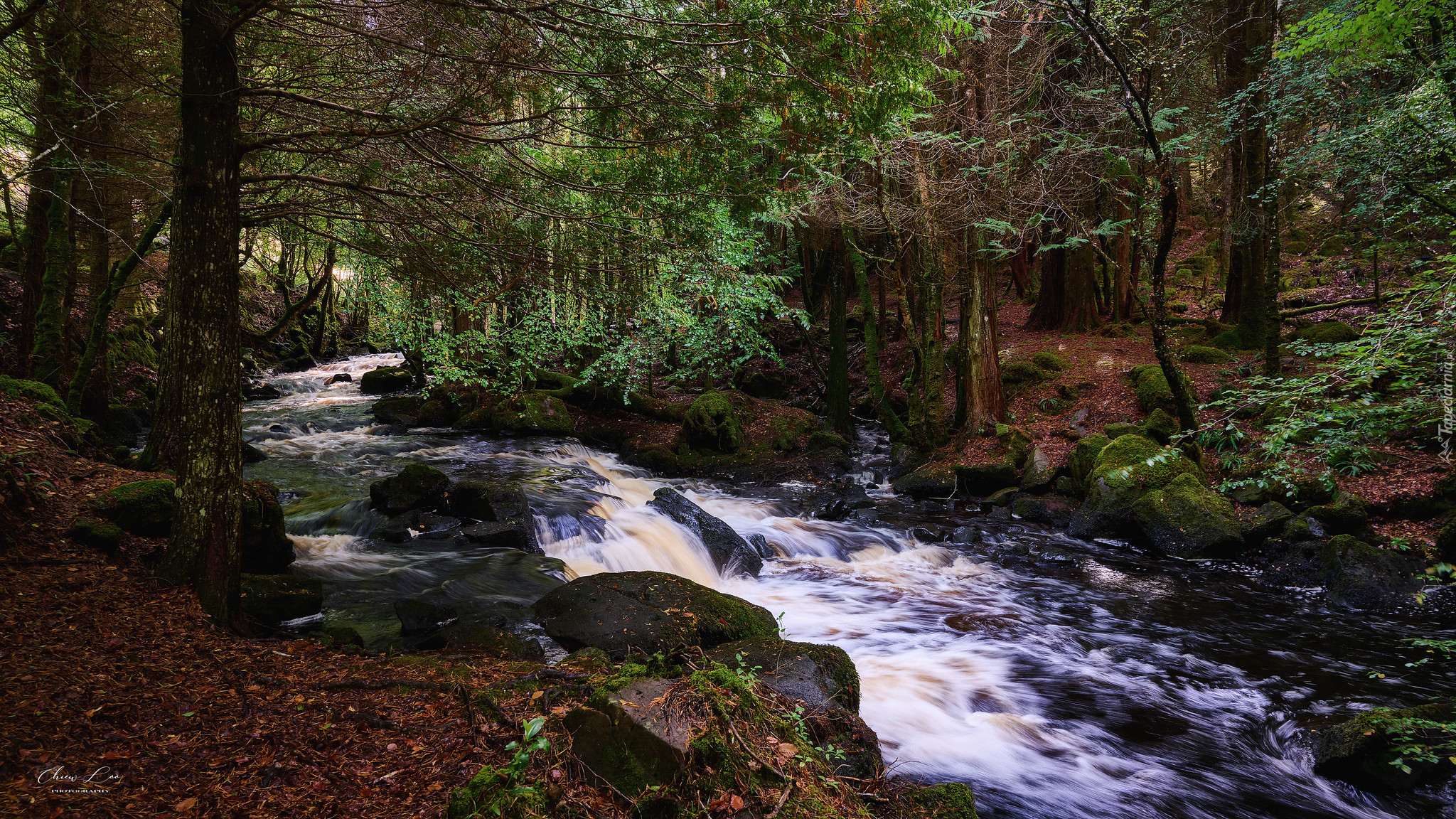 Edytor tapety: Drzewa nad kamienistą leśną rzeką