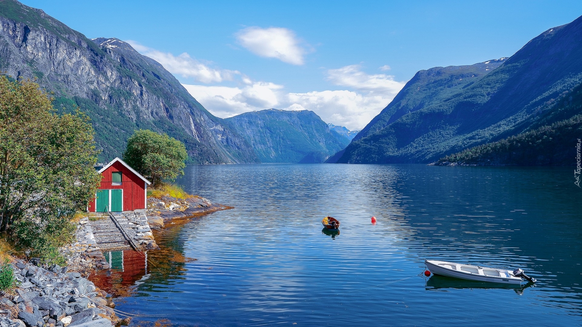 Edytor tapety: Domek i góry nad norweskim fiordem