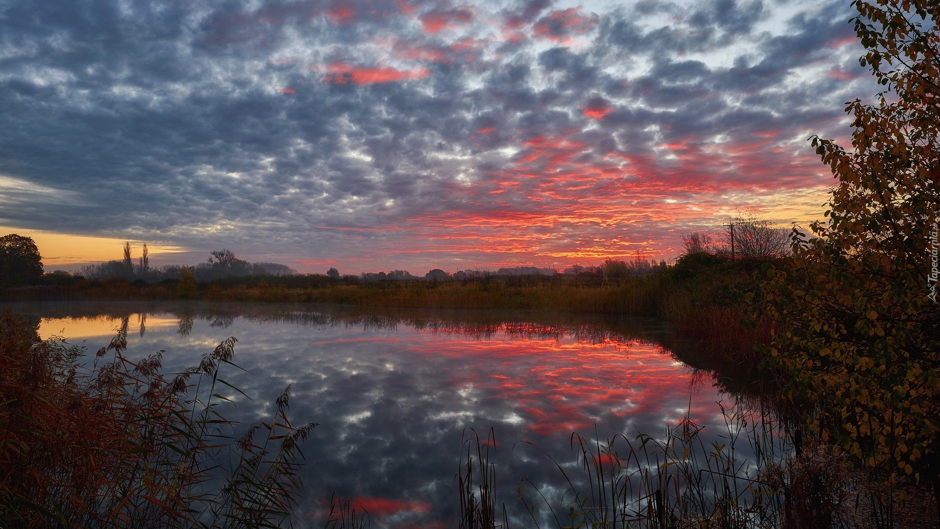 Edytor tapety: Odbicie chmur i kolorowego nieba w stawie