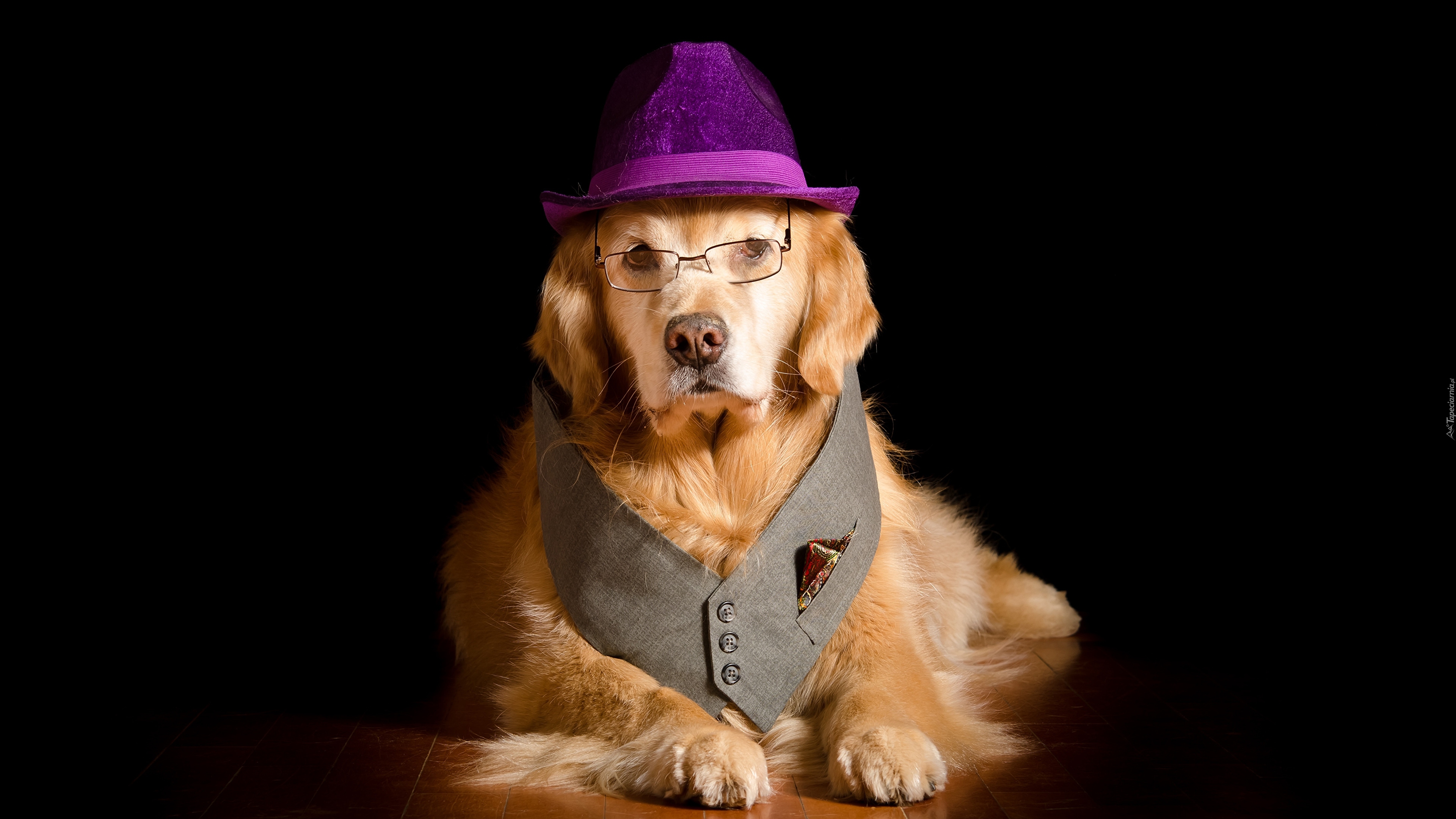 Edytor tapety: Leżący golden retriever w kapeluszu i okularach