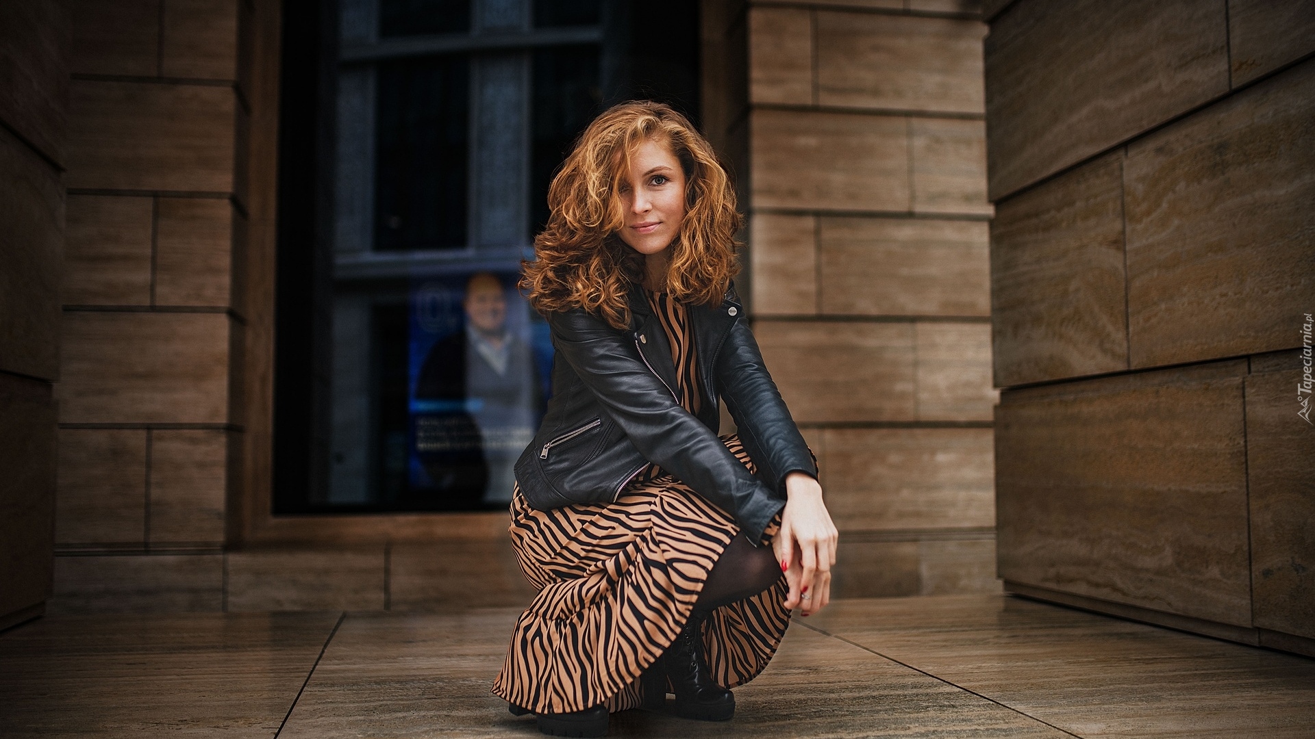 Edytor tapety: Kucająca dziewczyna w spódnicy i kurtce skórzanej