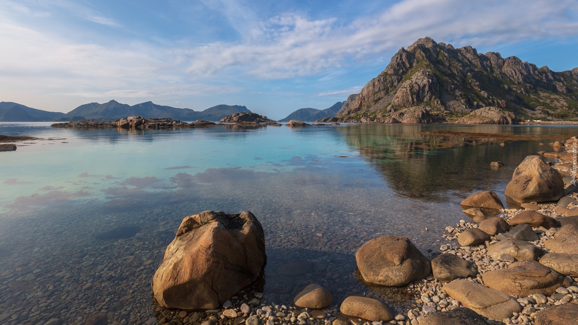 Edytor tapety: Widok z kamienistego brzegu na Lofoty