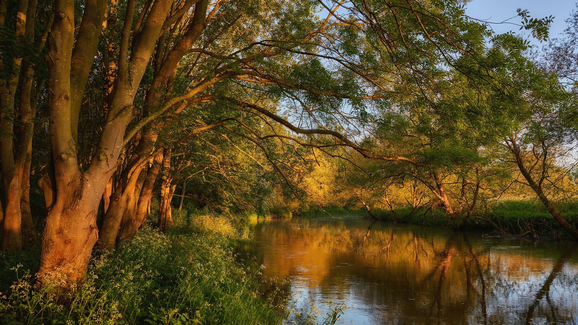Edytor tapety: Pochylone drzewa i rośliny nad rzeką Great Ouse