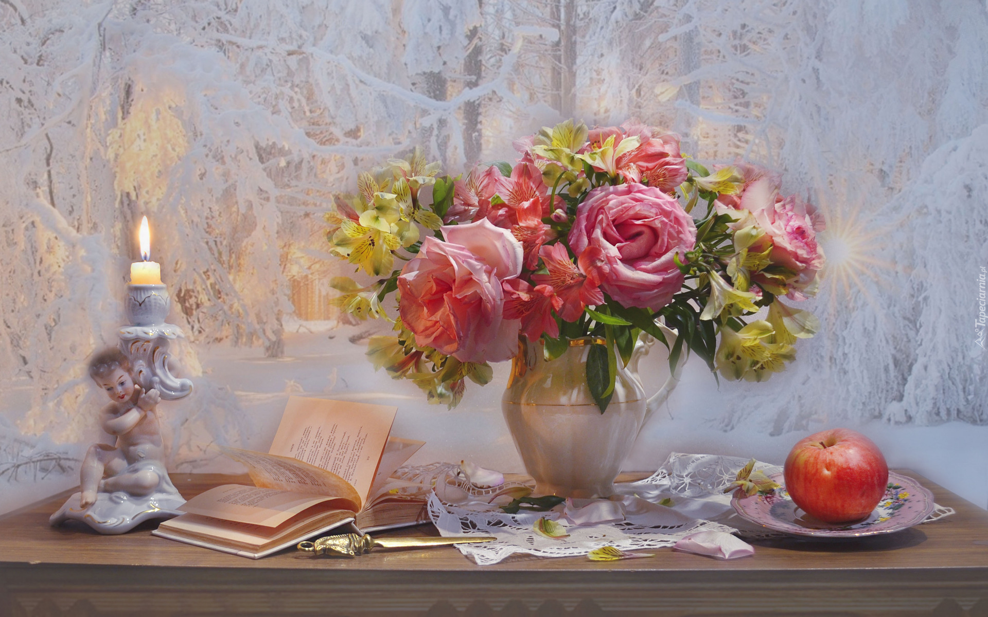 Edytor tapety: Kolorowy bukiet w dzbanku obok jabłka i książki