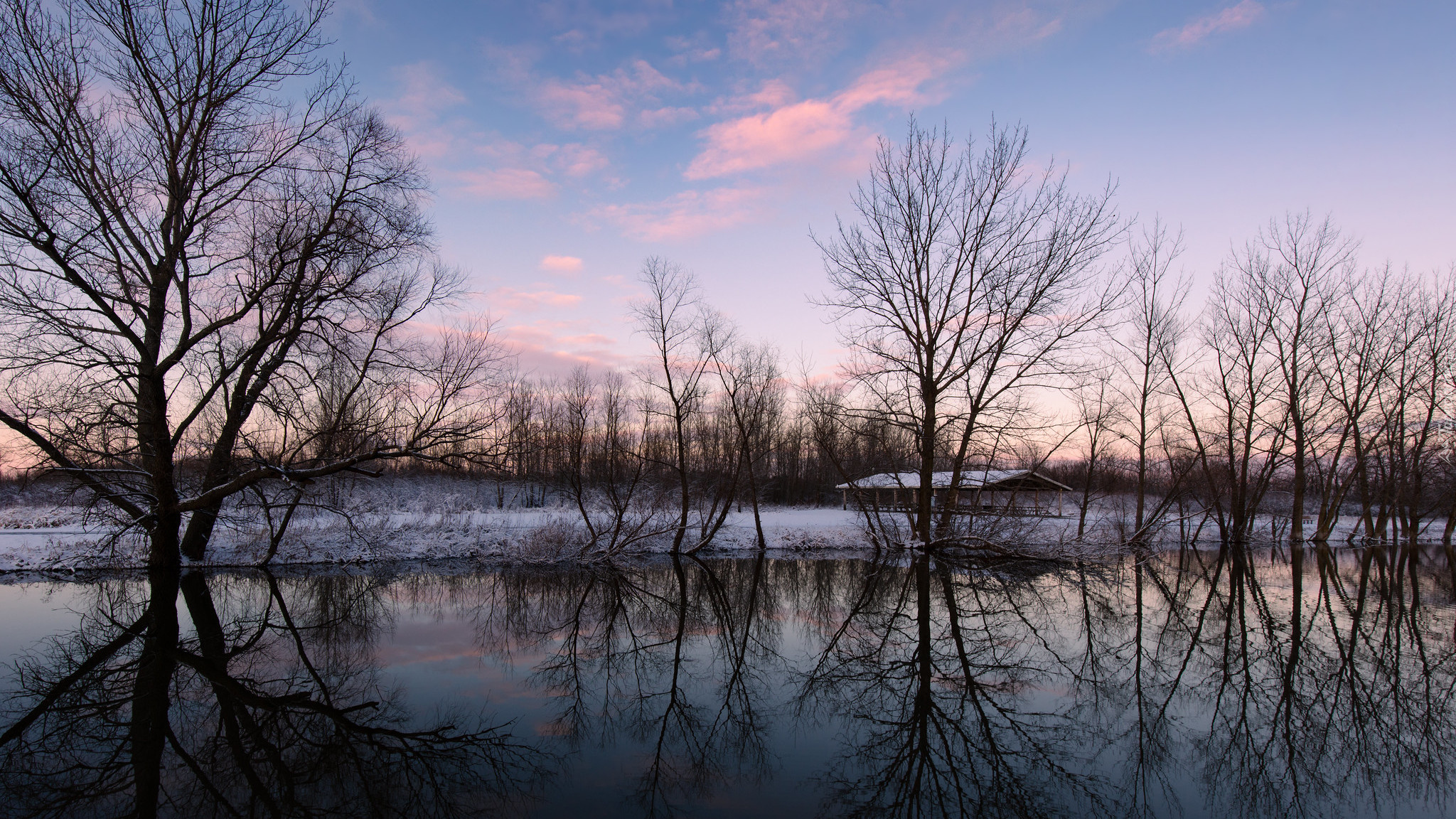 Edytor tapety: Wiata i bezlistne drzewa nad rzeką