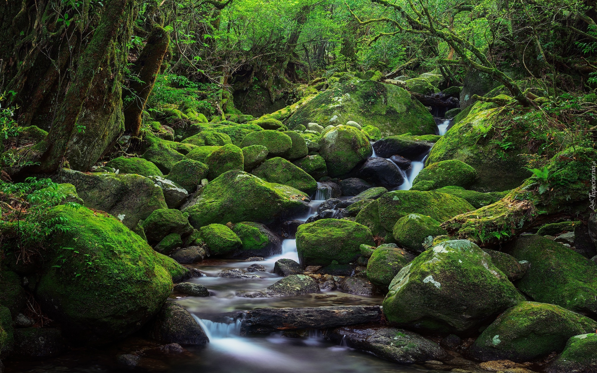 Edytor tapety: Omszałe kamienie przy leśnym potoku