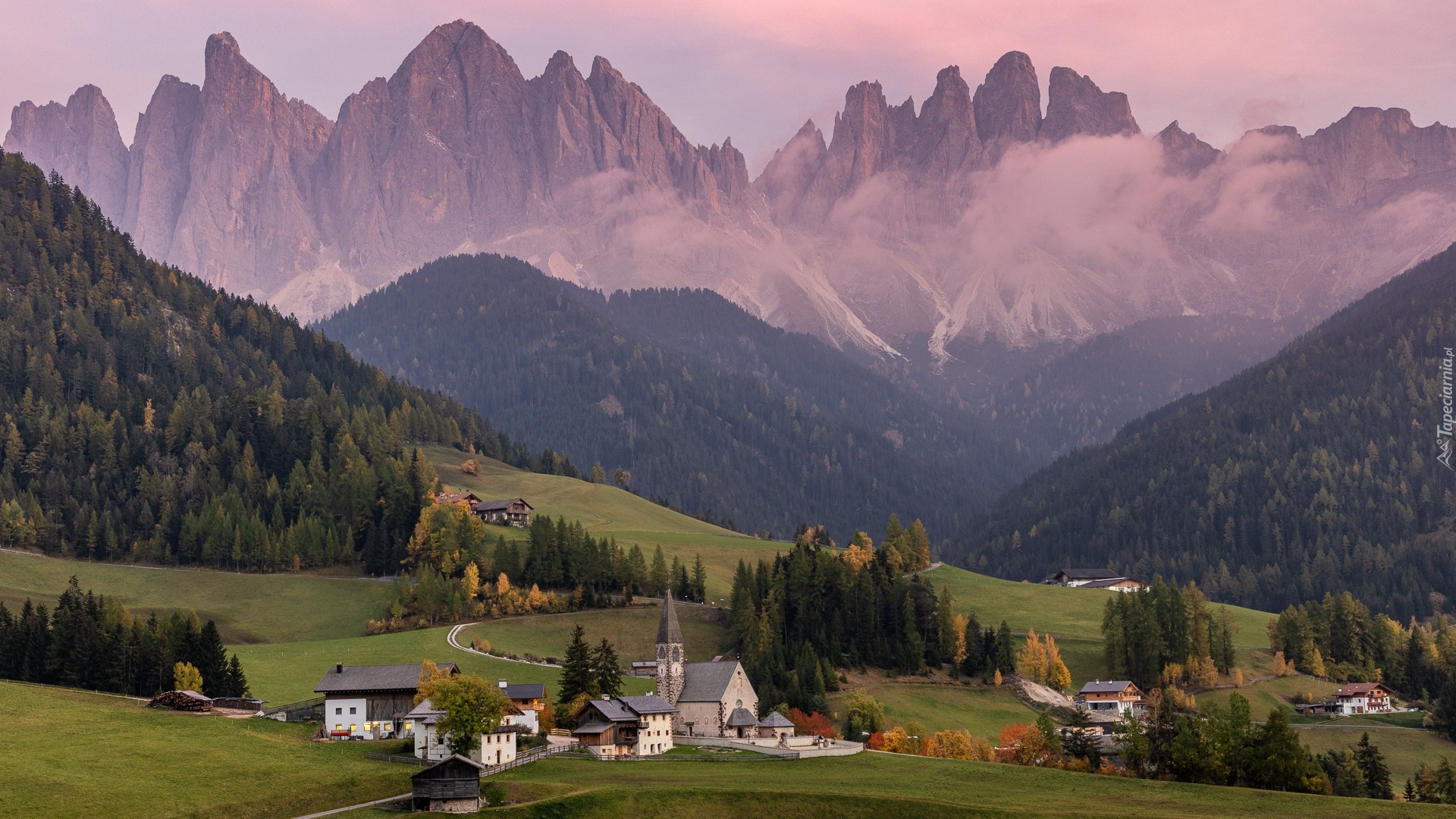 Edytor tapety: Wieś Santa Maddalena i mgła nad Dolomitami