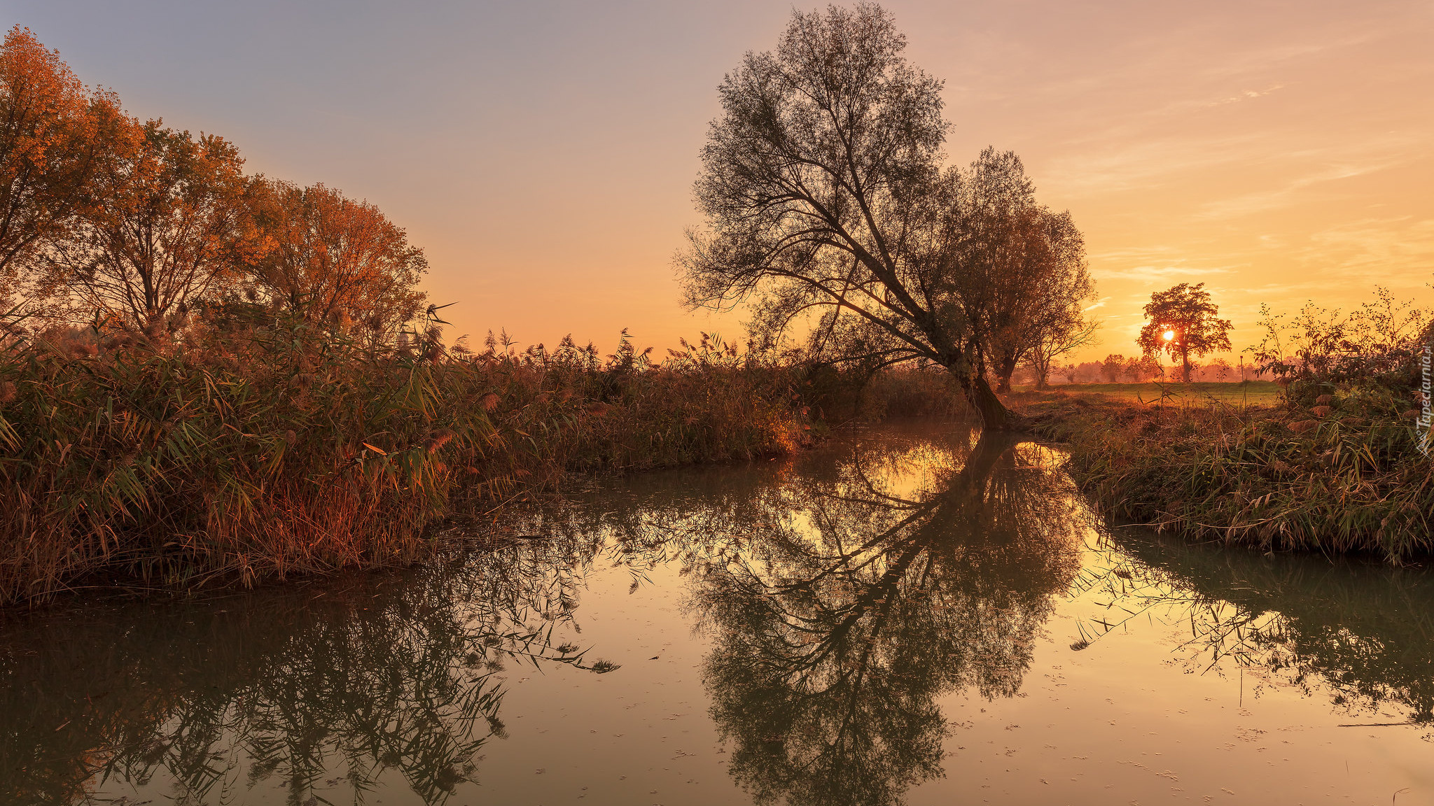 Edytor tapety: Odbicie pochyłego drzewa w rzece