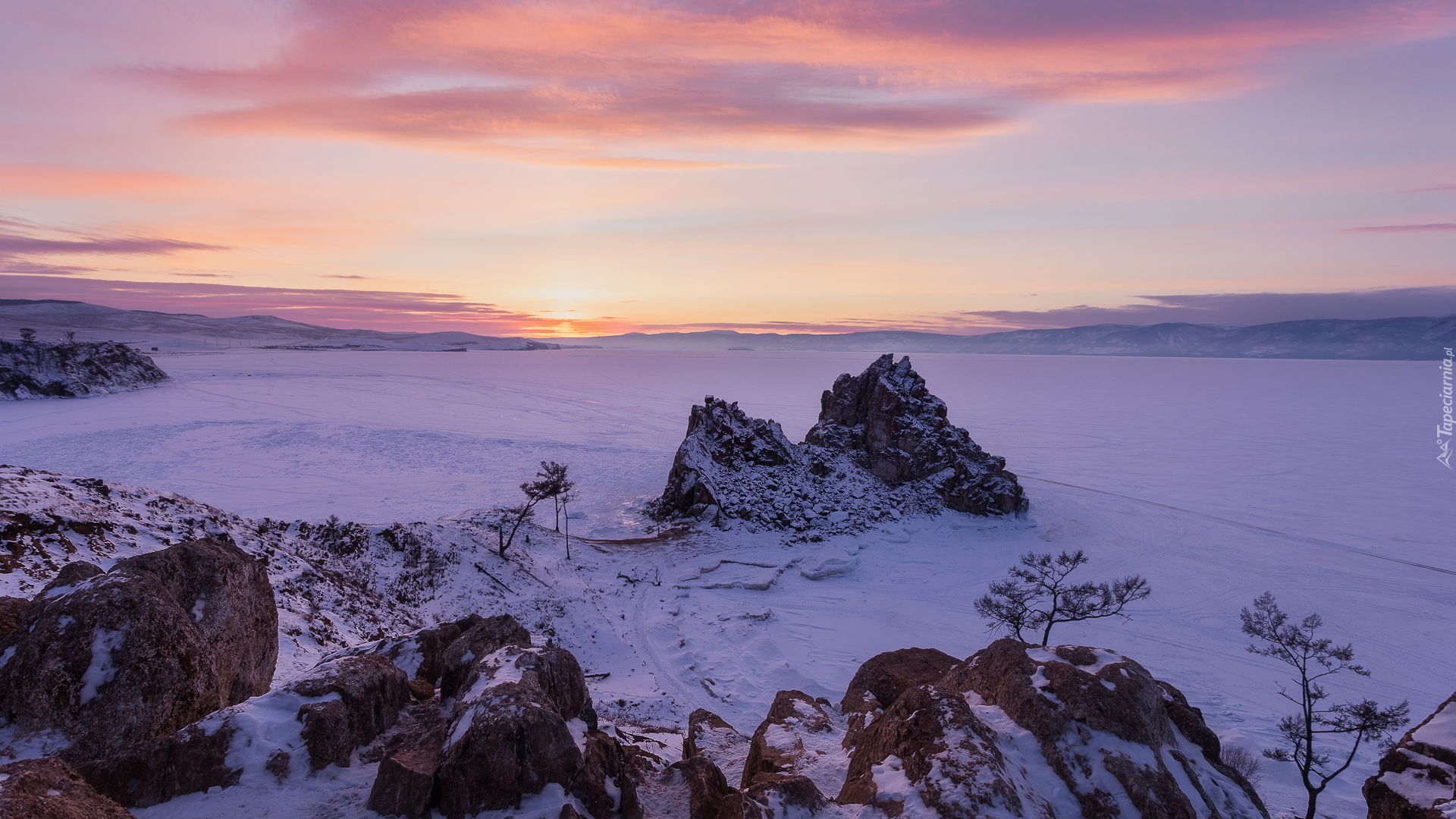 Edytor tapety: Skała Szamanka na ośnieżonym jeziorze Bajkał
