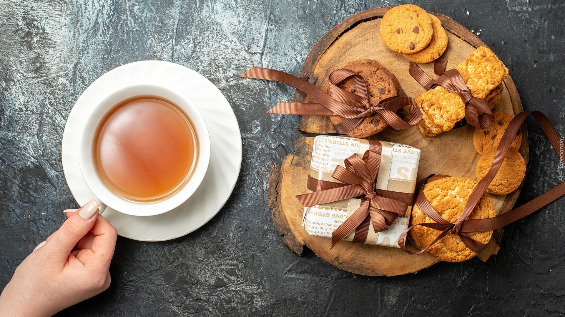 Edytor tapety: Herbata obok prezentu i ciastek na desce