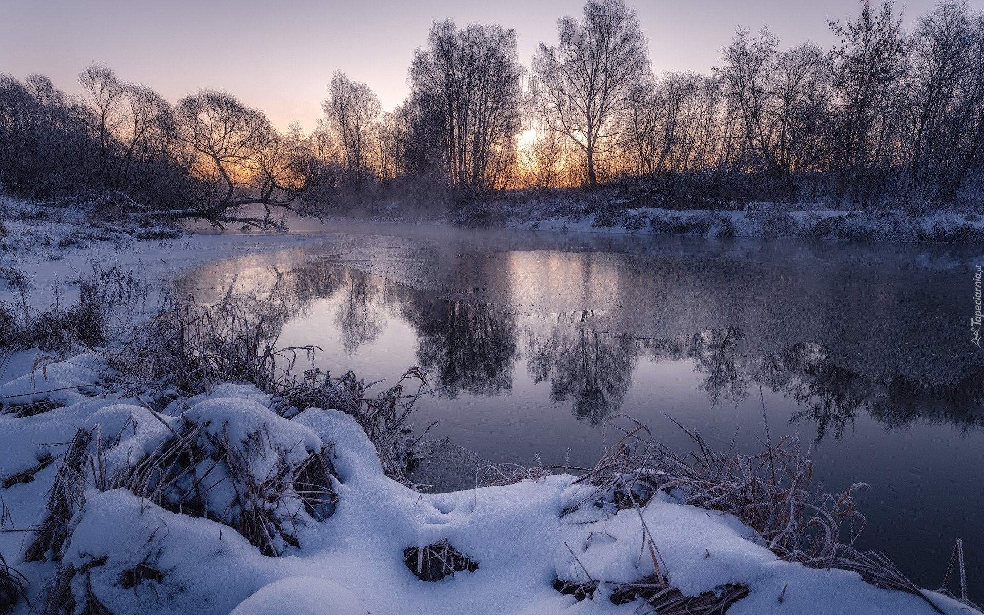 Edytor tapety: Drzewa i ośnieżone trawy nad rzeką