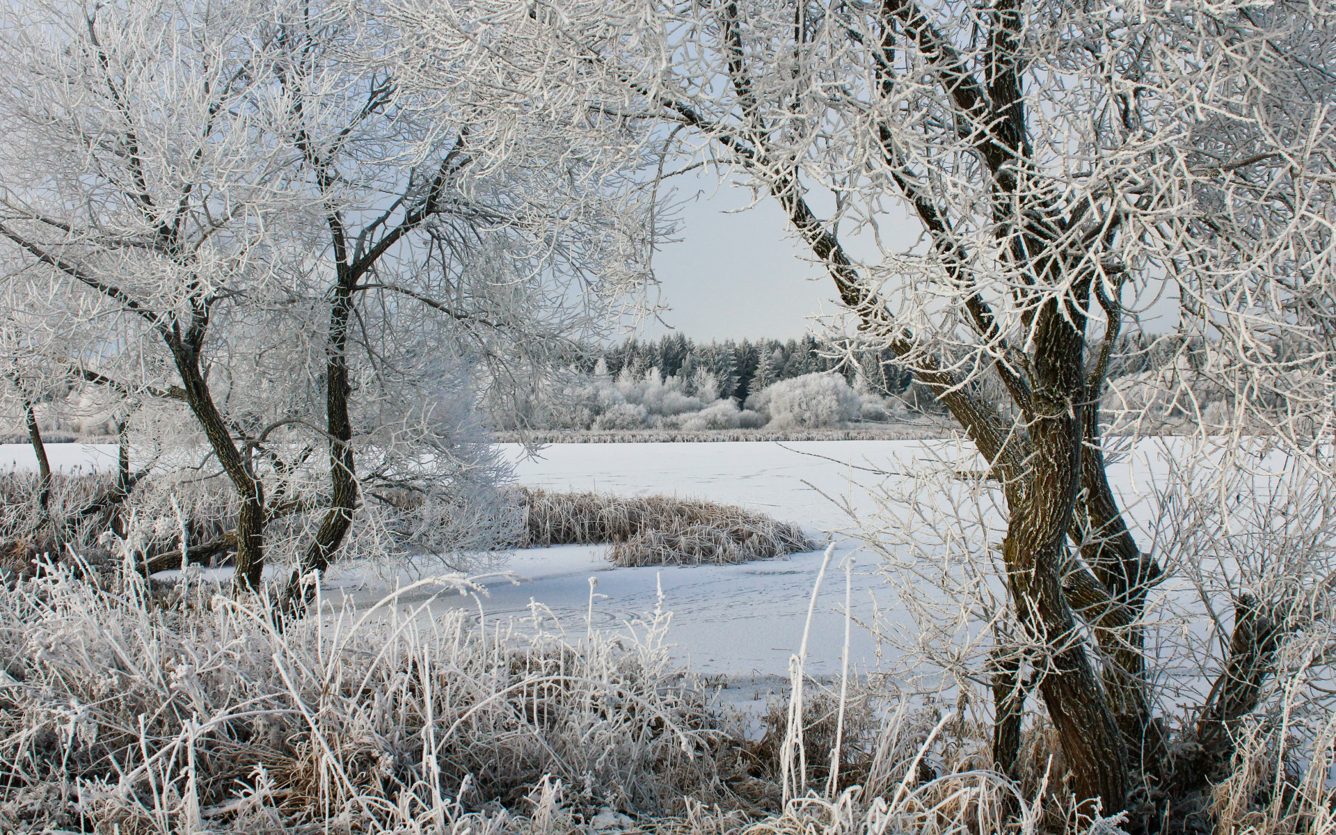 Edytor tapety: Oszronione drzewa i trawy nad jeziorem