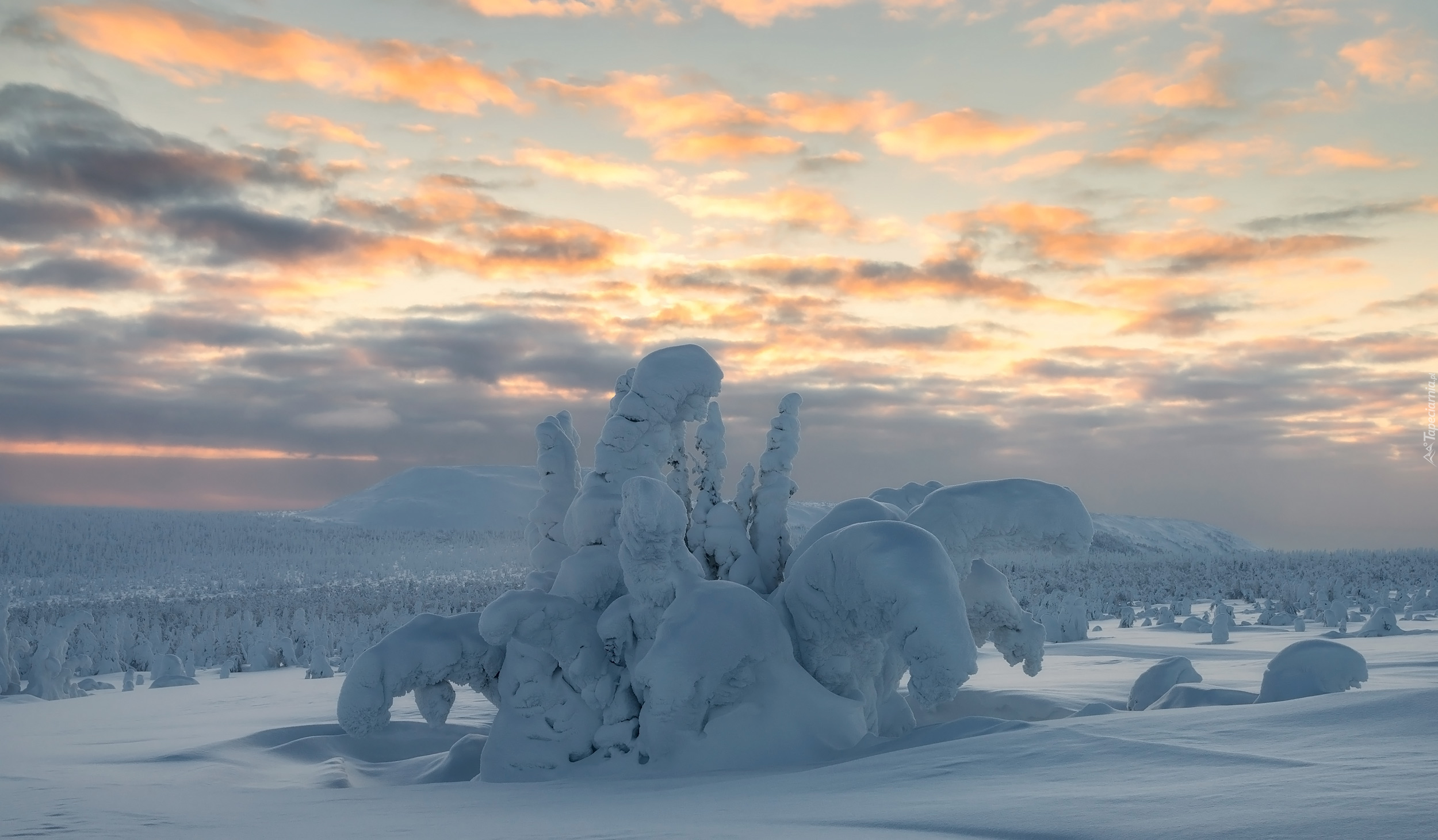 Edytor tapety: Zasypane śniegiem drzewa w zimowej scenerii