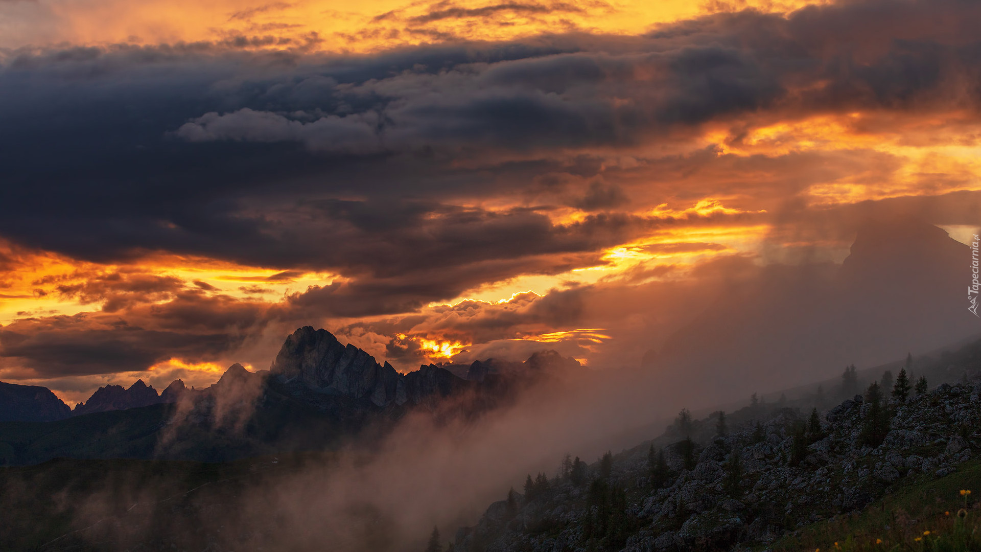 Edytor tapety: Zamglone szczyty pod kolorowym niebem