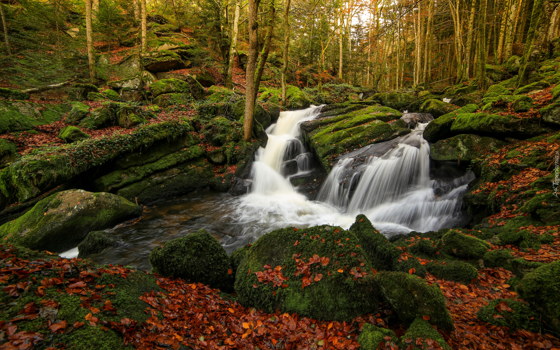 Edytor tapety: Leśny potok na omszonych skałach i kamieniach
