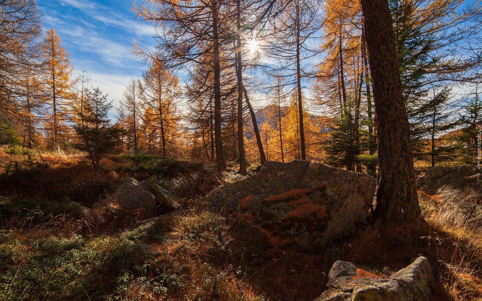 Edytor tapety: Rozświetlone pożółkłe modrzewie i kamienie na tle gór